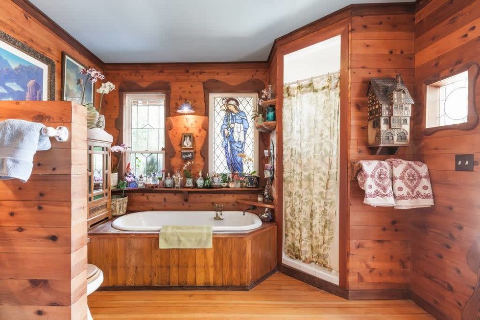 An antique Indonesian teakwood cottage sits surrounded by greenery on a property that also has a small deck and a hot tub. All wood-paneled and hung with an array of art, the place has a large living room and a bathroom with a soaking tub that redefines the word sanctuary.