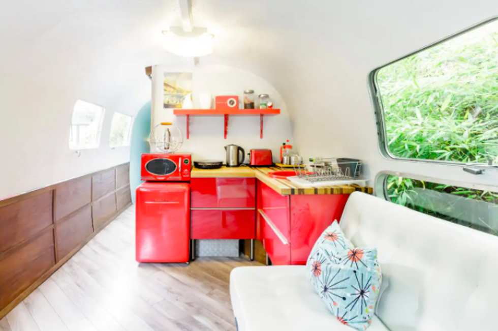 The design picks up on all those 1960s American wanderlust vibes with a retro-red kitchenette, world map wallpaper in the bathroom, and midcentury furnishings and accessories in the living space and bedroom. Kick back and pretend like you're anywhere else in any year other than 2020.