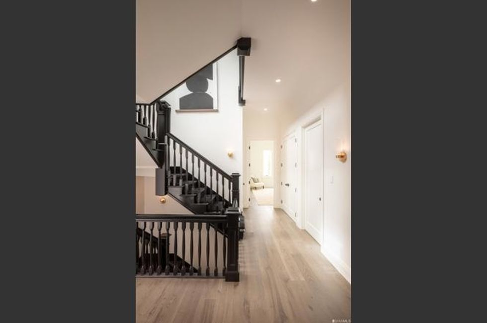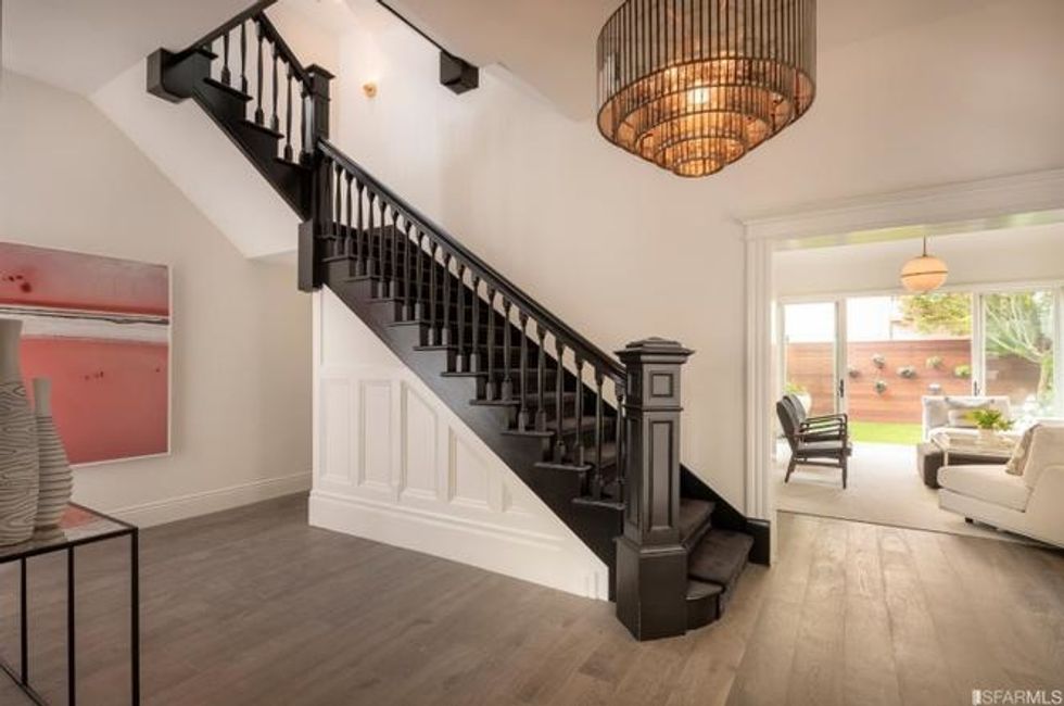 A large black door marks entry to the spacious foyer, lit by a gleaming mirrored chandelier, where you'll make acquaintance with that aforementioned staircase—a real beauty, and one that nods at the contrast between tradition and modernity that wends its way throughout the 4,600-square-foot, three-level house.