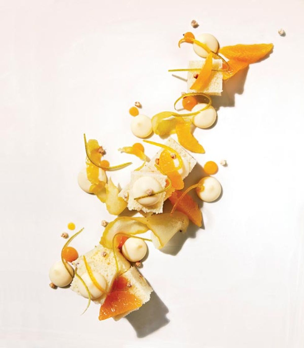 Lincoln Carson’s desserts at Michael Mina are artful and complicated in all the right ways. For his Orange Twist, he compiles cubes of orange milk sponge cake and candied Buddha’s hand—the gnarled yellow fruit prized for its rich, mixed-citrus essence—along with crystallized coriander, candied kumquats, and pomelo zest, mandarin orange, and white chocolate crémeux. Dots of bright gel made with Aperol, an Italian aperitif infused with bitter orange and rhubarb, add cocktail-inspired complexity.
