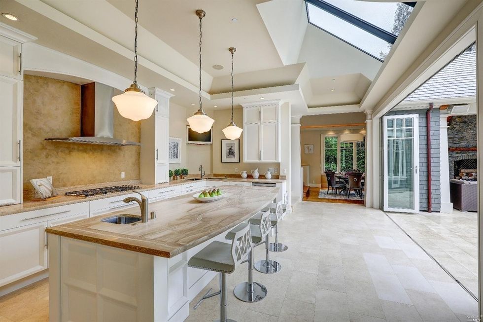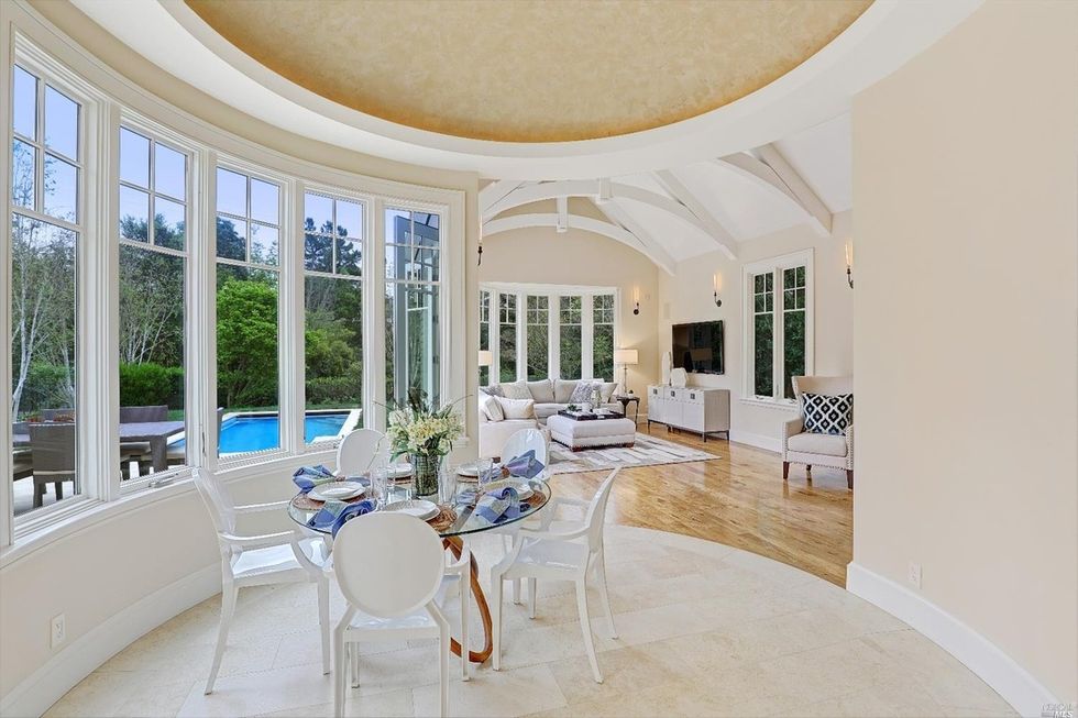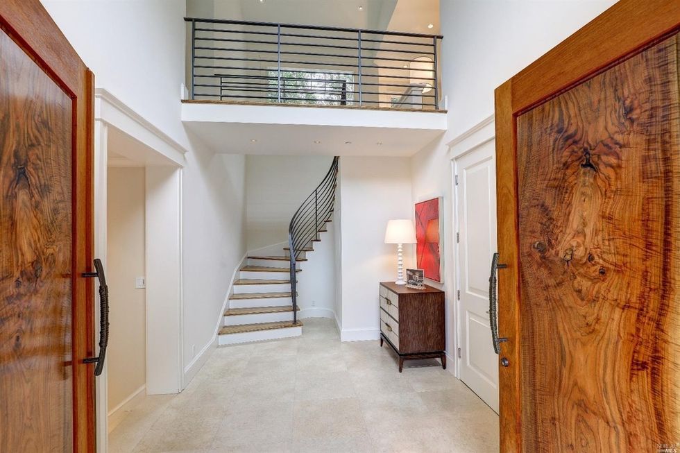 The gated, shingle-style residence, designed by Larkspur's Polsky Perlstein Architects, feels like a mini retreat, with a custom-made California walnut and teak front door opening onto rooms with soaring ceilings, hickory hardwood floors, fine moldings, and timeless designer finishes.