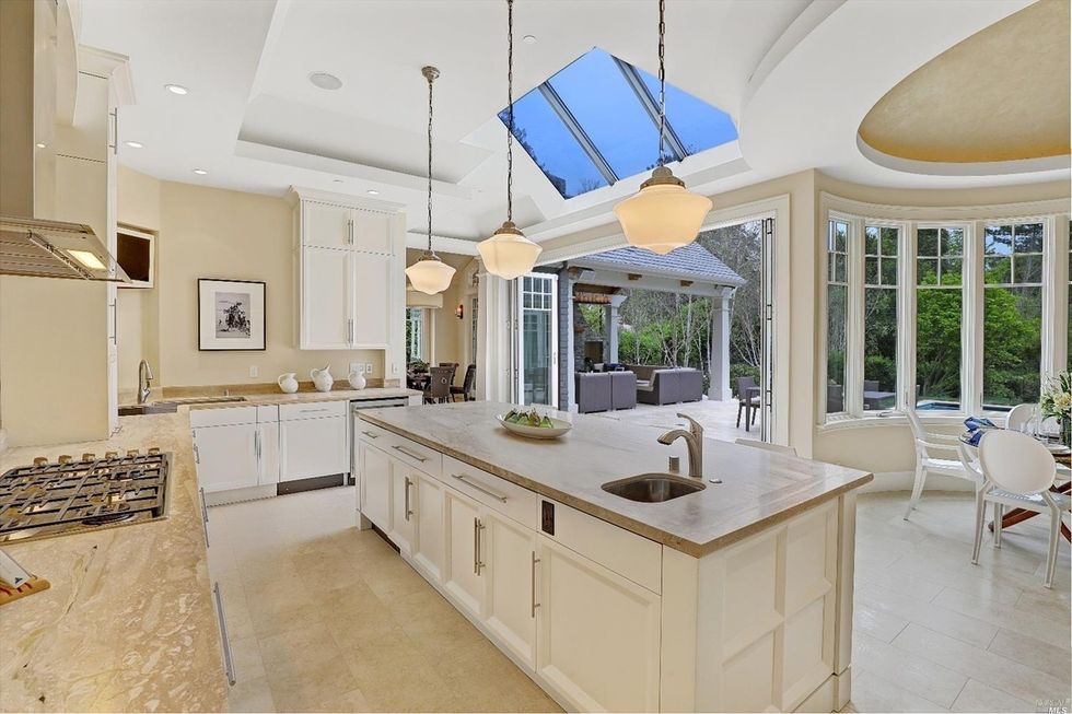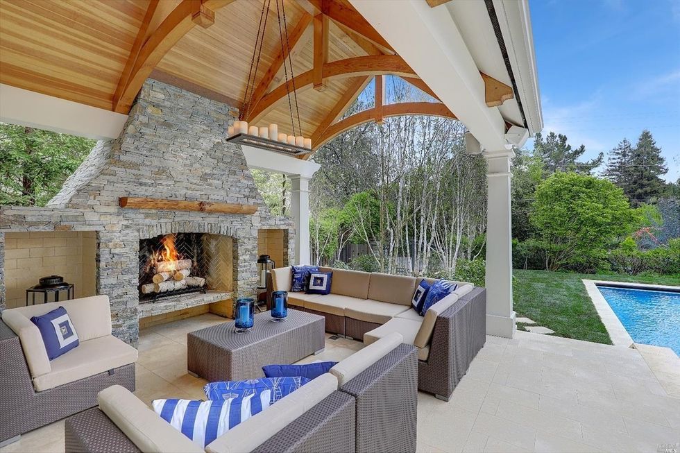 Designed by landscape architect George Girvin, the grounds are perfect for lounging with a sweeping lawn, limestone patio, a 270-square-foot loggia with a wood burning fireplace, and an outdoor dining area.
