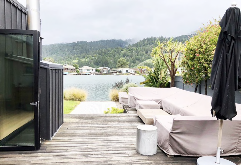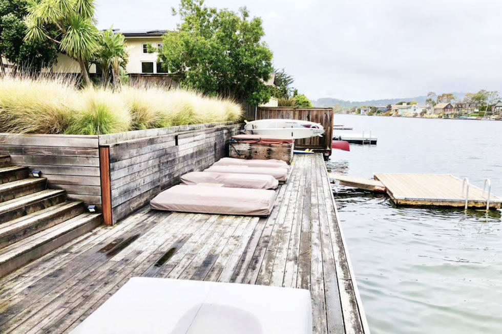 Separated from Seadrift Lagoon by just a private hot tub and lounge chair-topped dock and deck, this Stinson Beach home, decorated in neutral hues and effortless furnishings, exudes surfer-chic vibes. Thanks to two master bedrooms, plus a bunk bed room, an open floor plan, and a multitude of outdoor hangout spaces, you can easily take advantage of warm fall weather with a group of friends and family. After a long day at the beach, rinse off in the outdoor shower, throw open the huge dining room doors for dinner with a view, or chill out under the stars at the fire pit. // Book your stay at airbnb.com.