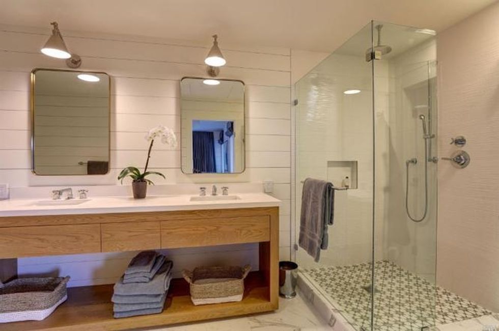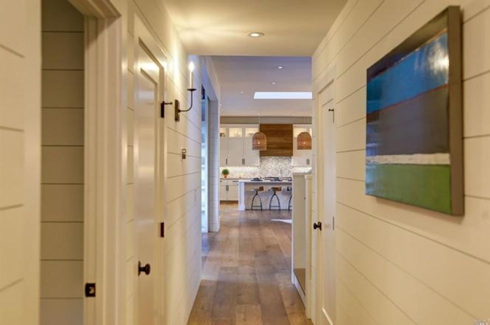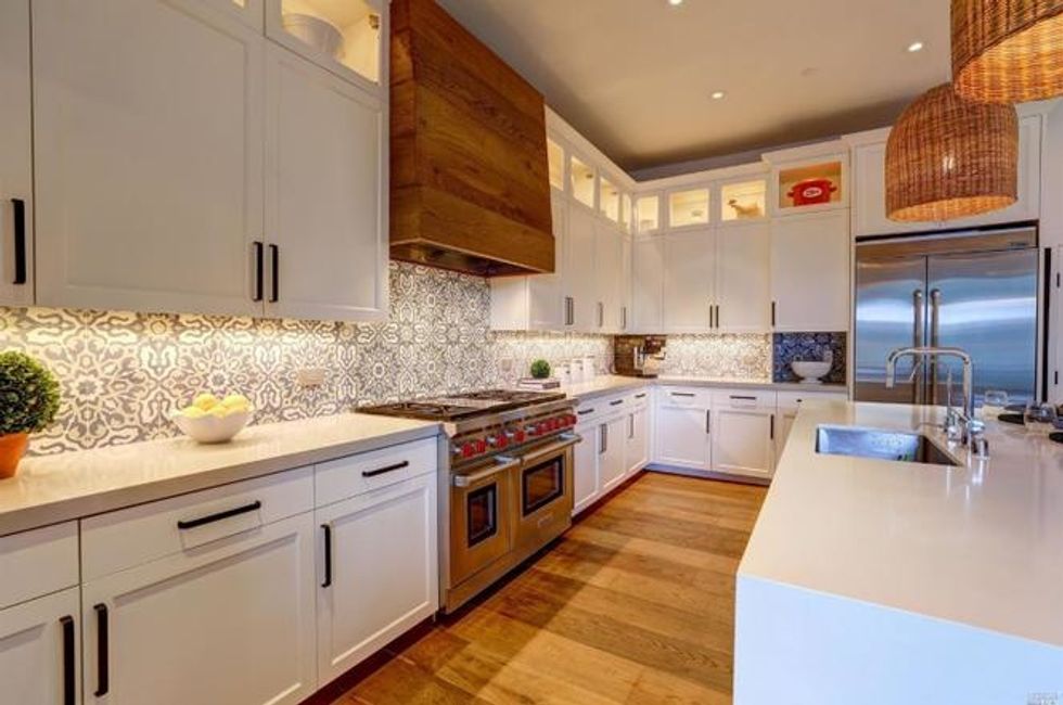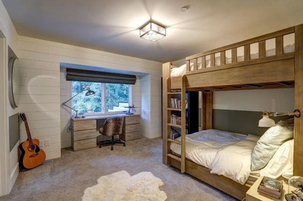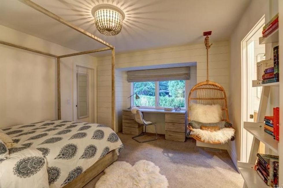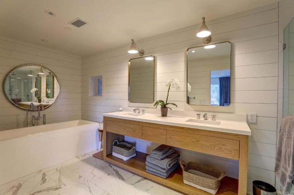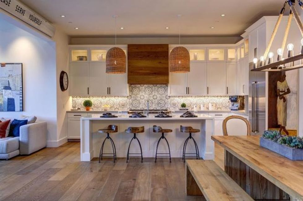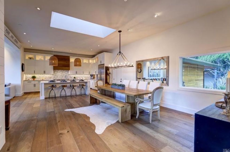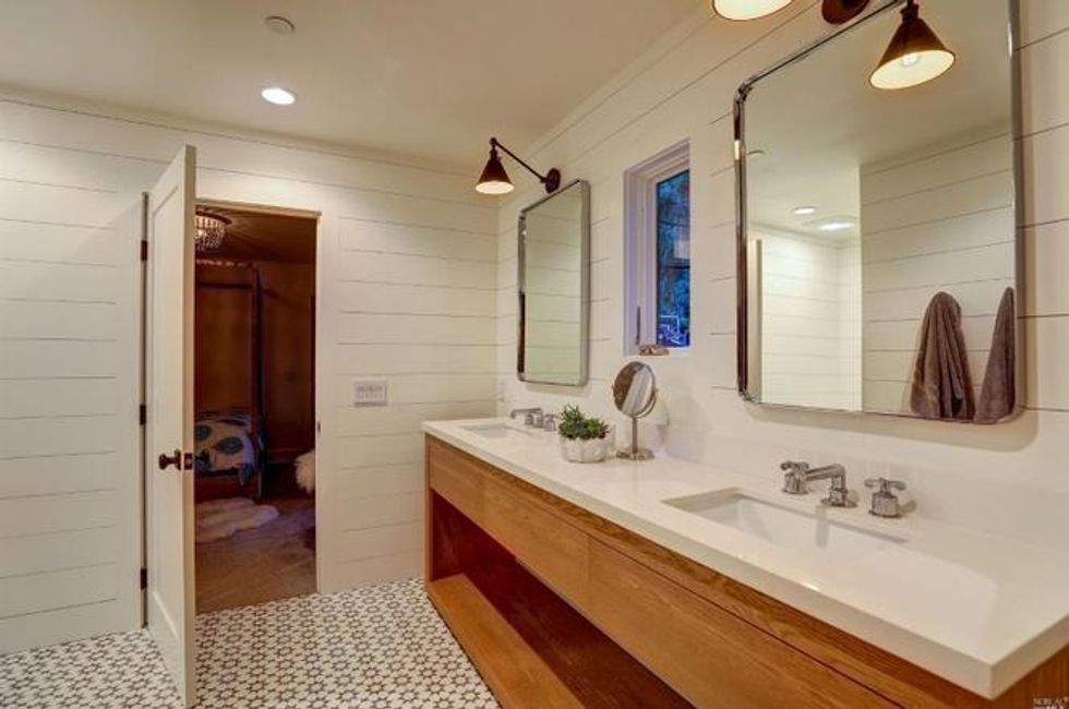 Cathedral-style ceilings with exposed beam ceilings expand the spaces, while a fireplace amps up the coziness. Additional beautiful details include milled woodwork, wide-plank oak flooring, Moroccan-inspired tiles, and skylights that spill plenty of natural light for a quiet sanctuary vibe.