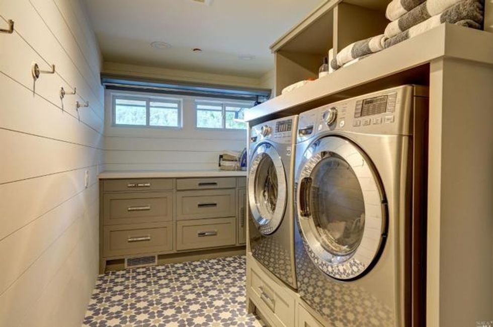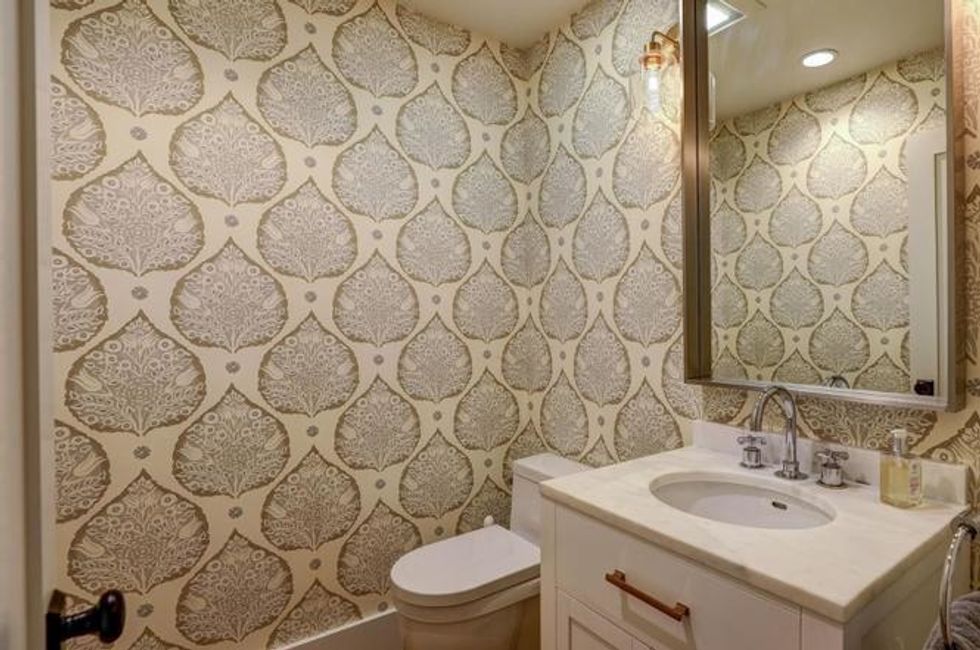 The open floor plan is primed for entertaining as the kitchen and dining room flow into the great room, which opens to the deck, pool, and spa. Inside, hints of nature are to be found throughout, with leaves climbing the wallpaper and suns and flowers embedded into tiles.