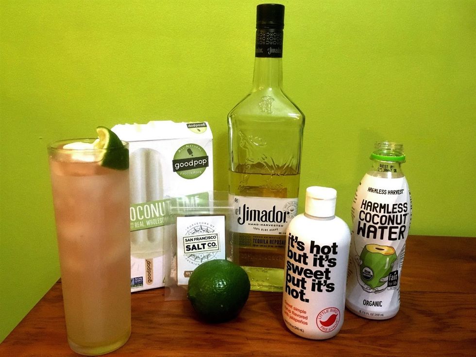 3. Top with Harmless Harvest organic coconut water and two slices of GoodPop coconut lime frozen pop.