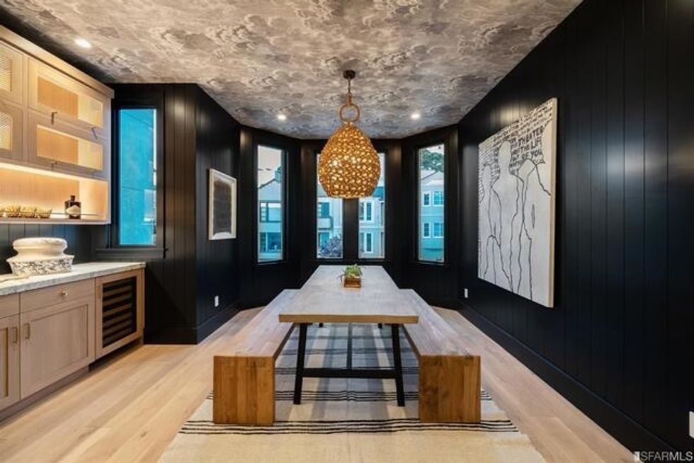 The main level is the heart of the home. A large great room has a fireplace, built-in seating nooks, and windows that let in a panorama of the Golden Gate Bridge. In the semi-open plan here, it's the dramatic chef's kitchen—with its structural marble island-cum-bar seating, stylish backsplash, and organic woven pendant lights—and adjacent dining room, done in noir paint with bay windows and a moody wallpapered ceiling, that really get our black-emoji-hearts beating. A cocktail bar with wine and stemware storage completes the sultry happy hour vibe. For cozier encounters, a small nook beneath the stairs is perfect for hiding out with a book.