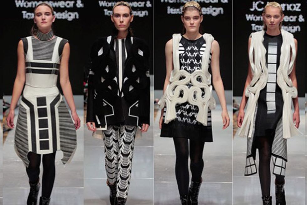 AAU student JC Munoz looked to the sky to find inspiration for his graphic graduation collection, which jetted down the runway with curves and silhouettes reminiscent of F-16 and B-2 fighter planes. Munoz's own textiles demanded attention with strong lines and prints that became all the more bold when layered together.