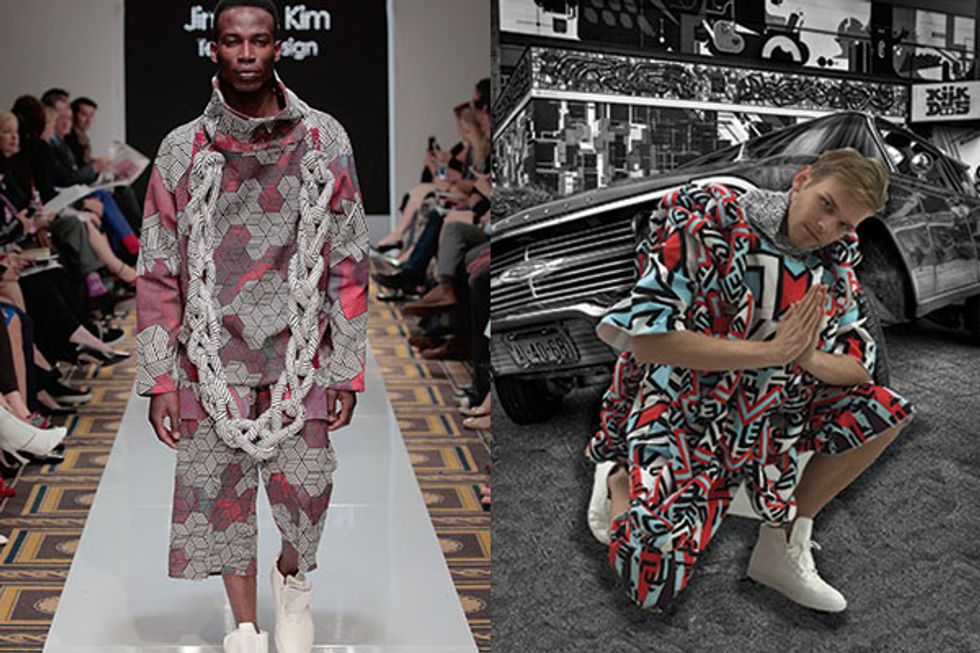Menswear designer Gyuwon Jeong took aim at a niche population of "vegan gangsters" with a collection that riffed on inspirations from Mexican "Cholombians," the artwork of Maimouna Guerresi, and South Africa's Ndebele tribe. The explosion of references, exaggerated proportions, and new take on menswear staples were a wakeup call the AAU show. Equally impressive were the tribal-meets-geometric patterns of textile design student Jimin A. Kim.