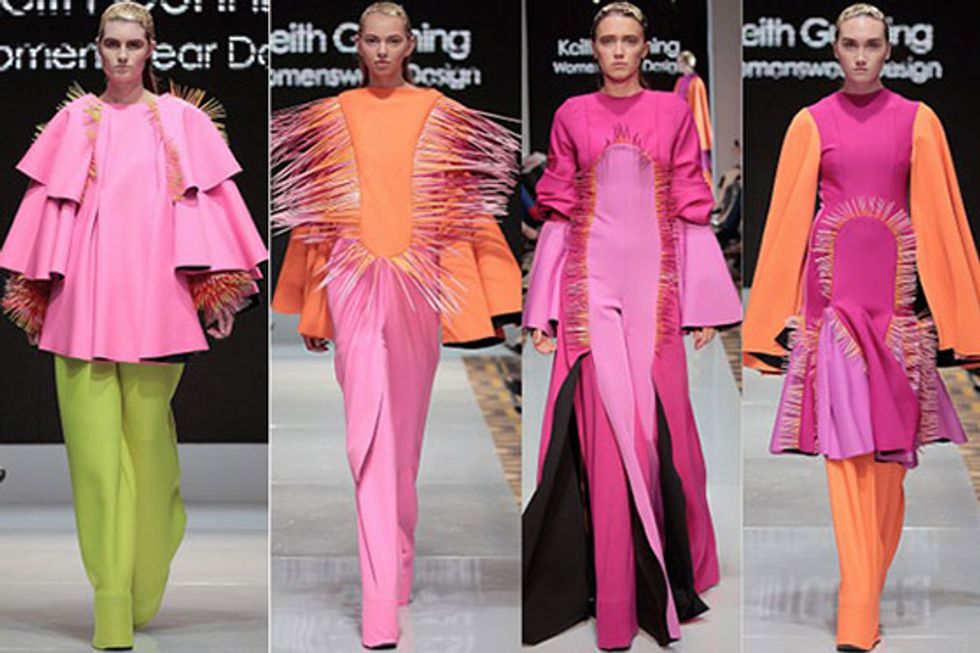 Keith Gunning's buzzworthy collection for AAU was inspired by the 1980s legendary Australian designer and performance artist Leigh Bowery. True to Bowery's theatrical antics, Gunning's pieces sounded the alarm with audaciously bright hues of neon neoprene.