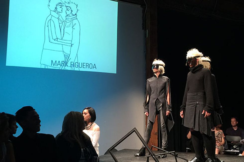 Mark Figueroa's Fog collection, for the SF Art Institute's Talk Style show, turned out edgy men's fashion that was also wearable. There were whispers of '90s grunge, with moto-style details, skirts that worked, and a futuristic vibe that happened to take inspiration from 17th century Spain. The clothing focused on "gender rhetoric and equalizing genders in the fashion industry."