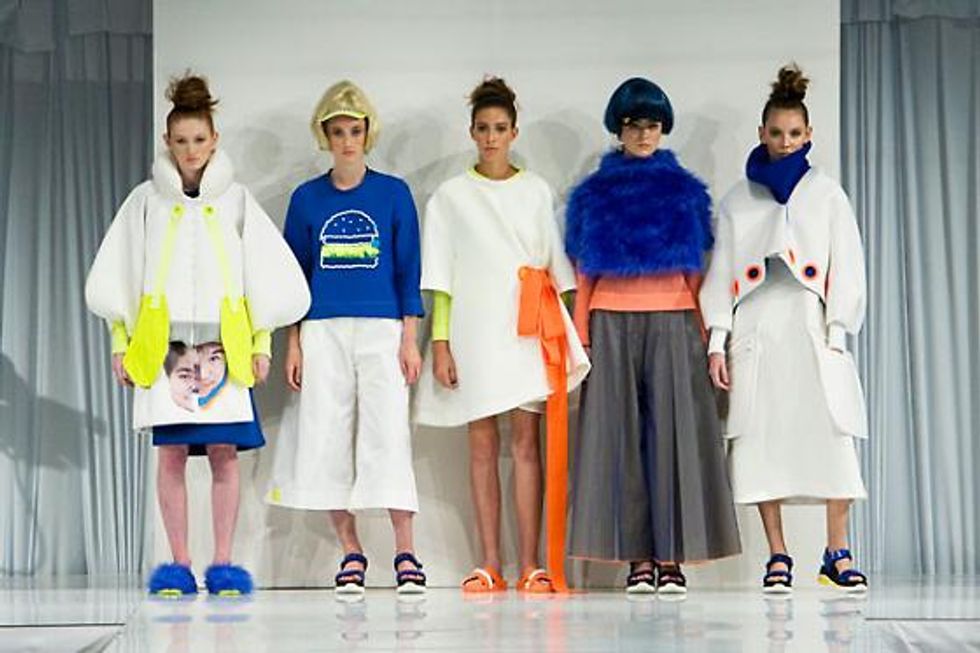 California College of the Arts design student Hao Dong was already on our radar. Her collection addressed such topics as fast fashion, urban life, and pop culture, all in an edgy, futuristic, and colorful way.