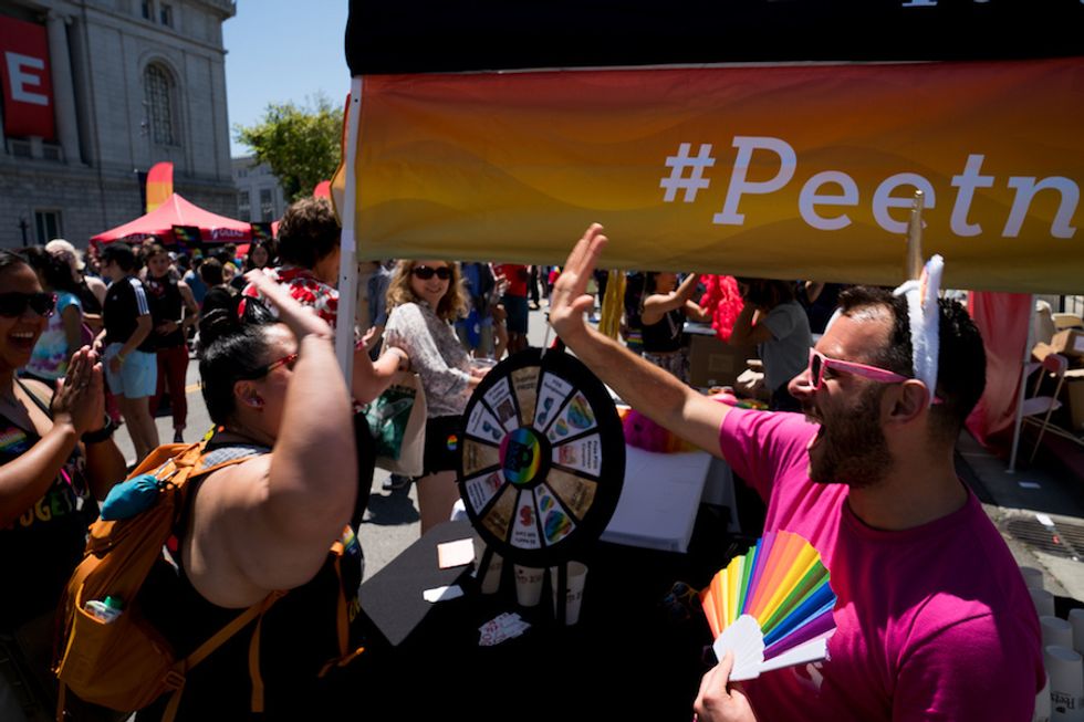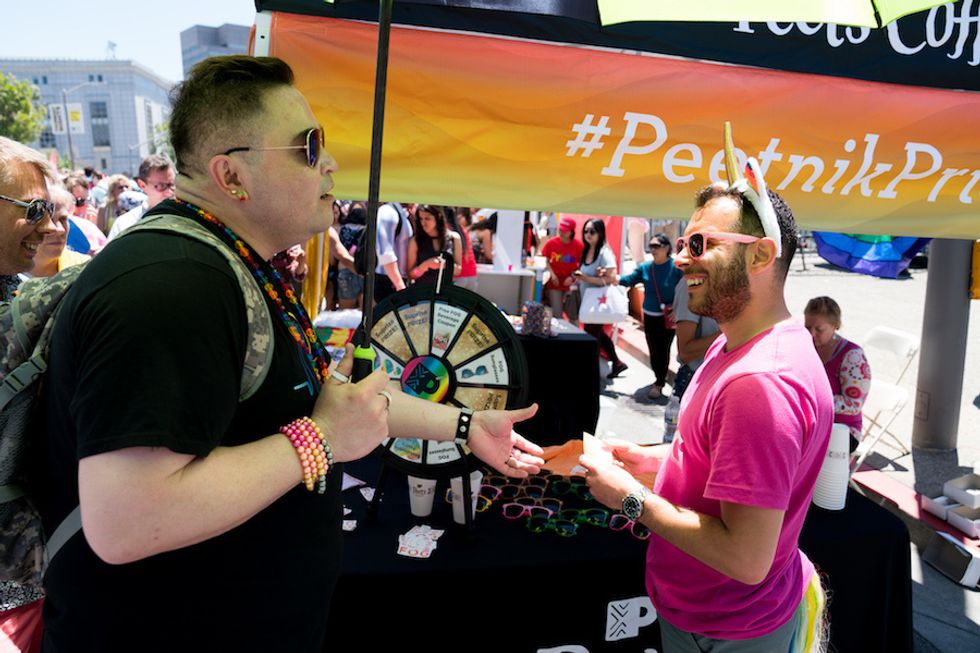 Partygoers lined up at our Pride booth in all their costumed glory for a chance to spin the Peet's prize wheel and win Fog-themed sunnies, T-shirts, stickers, reusable cups, and the piece de resistance: a 12-month supply of Peet's coffee. Winners then got decked out in an epic selection of costumes for a photo opp. Get a peek at the festivities in our slideshow below.