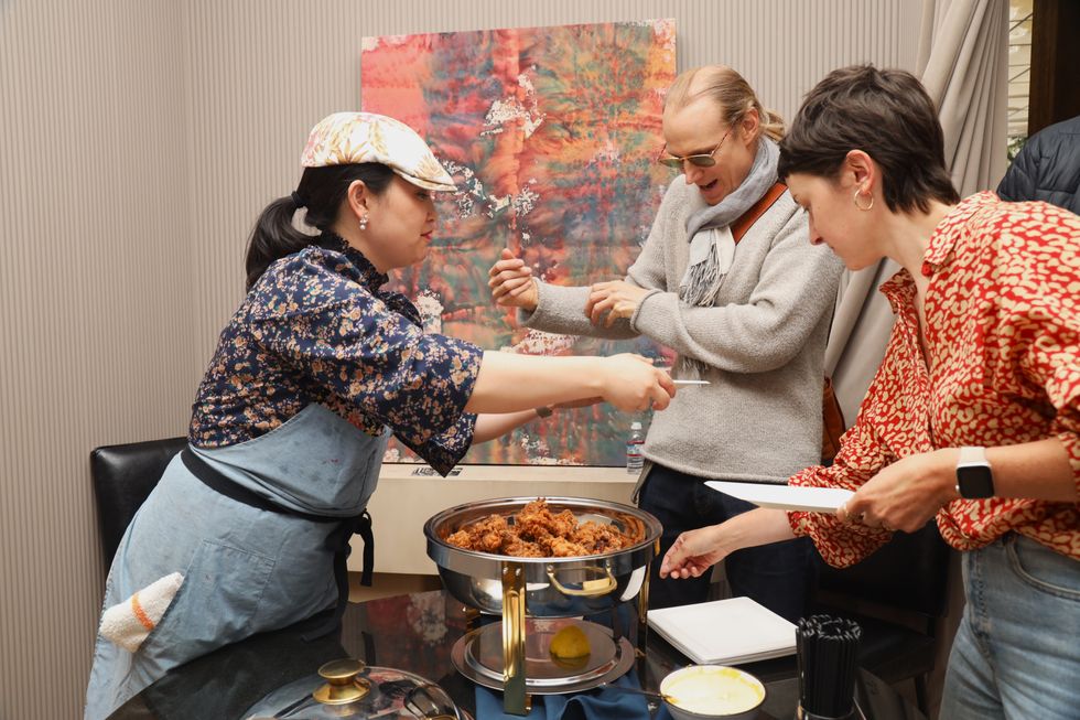 Cassava co-owner Yuka Ioroi serves the restaurant's famous fried chicken to glass artist Jason Stropko and 7x7 writer Lisa Plachy.