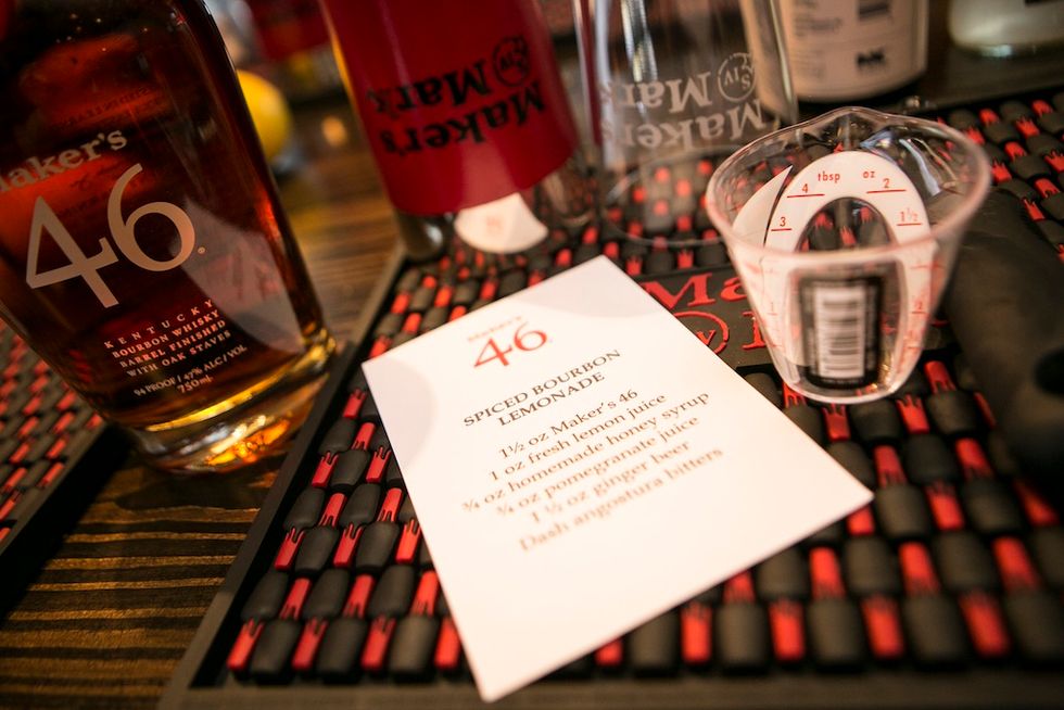 Makers 46, fresh lemon juice, house made honey syrup, pomegranate juice, ginger beer, dash angostura bitters