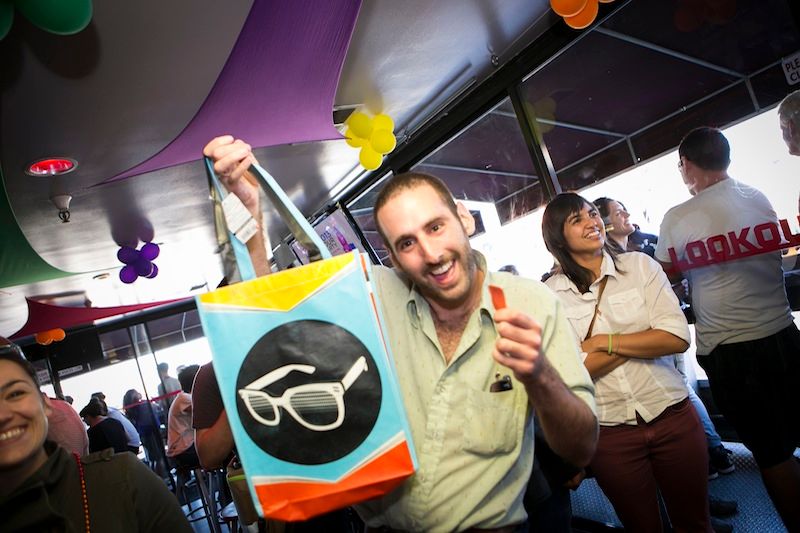 7x7 Pride 2013 Happy Hour at Lookout: raffle winner Dan with a Chronicle Books prize bag