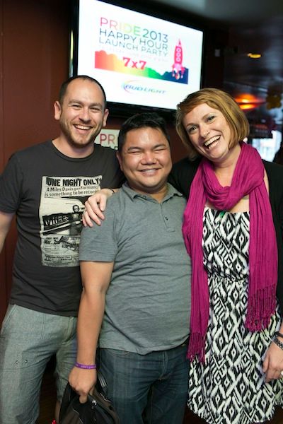 7x7 Pride 2013 Happy Hour at Lookout: 7x7's Riley Manlapaz flanked by Ben Hopfer and Hallie Kilbert