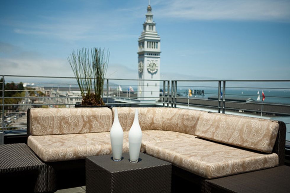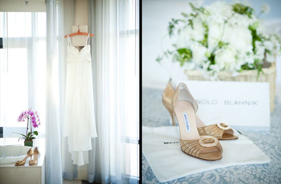 The large terraces off the penthouse suite in the Hotel Vitale provided a scenic setting for the ceremony and before-and-after cocktails. The whole event was short and sweet (the bride’s aunt and uncle officiated and the groom gave a tear-inducing toast), with welcoming cocktails, wedding vows and post-ceremony drinks and buffet wrapping up in just three hours. After it was all said and done, everyone changed clothes and hit North Beach for pizza and dancing.
