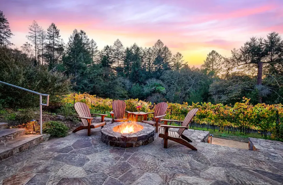 Seats by the fire pit at Halleck's wine lodge.