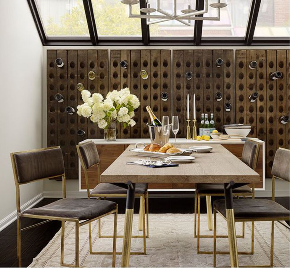 In truth the room only felt small. By installing deconstructed riddling racks (old wooden racks used to store bottles in wine caves), she made the room seem more expansive. "I think that large gestures make a room look bigger," she says. The panels float on brackets away from the wall, allowing bottles that will be opened in the near future to rest there.