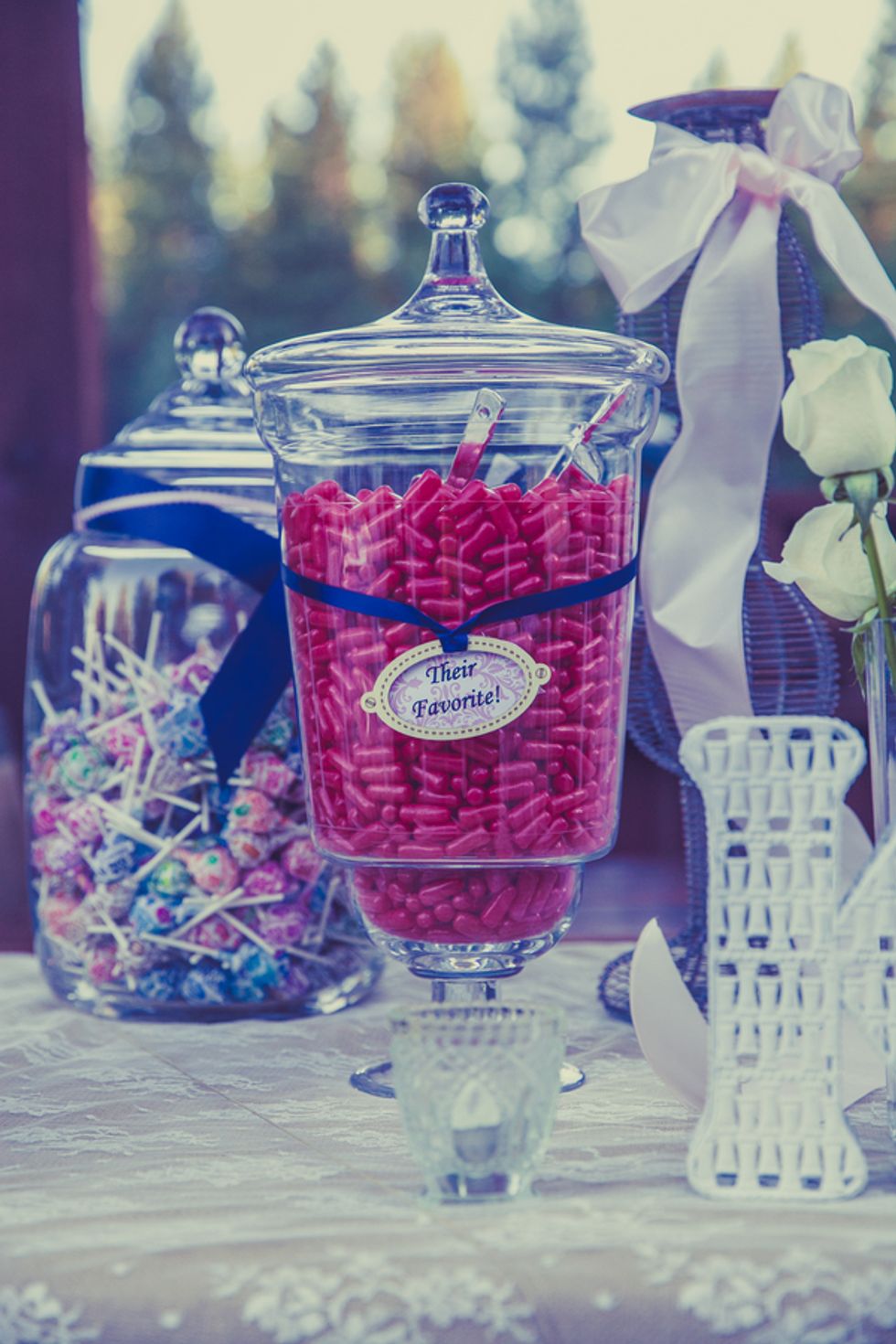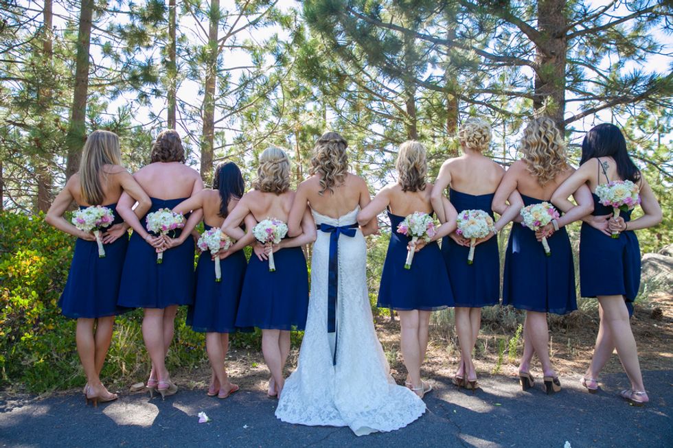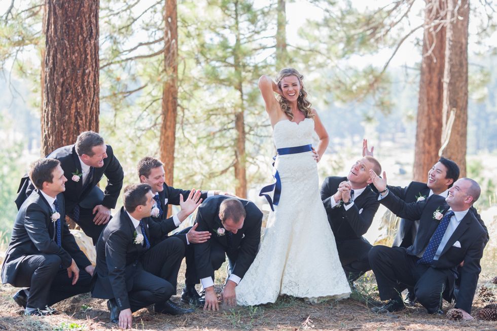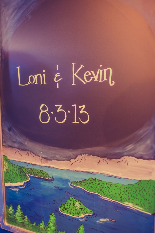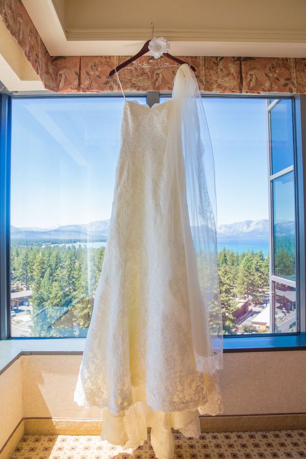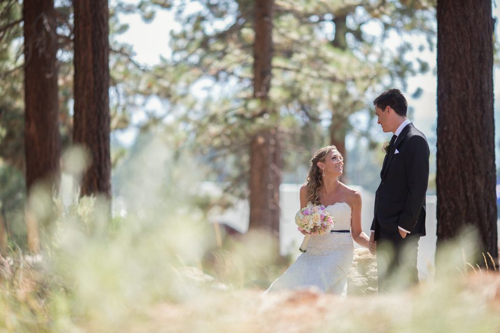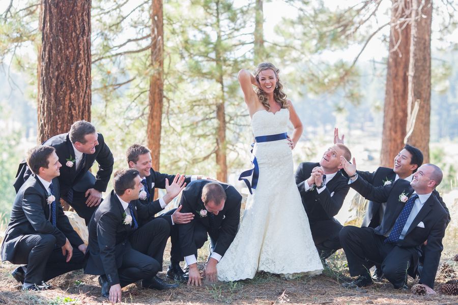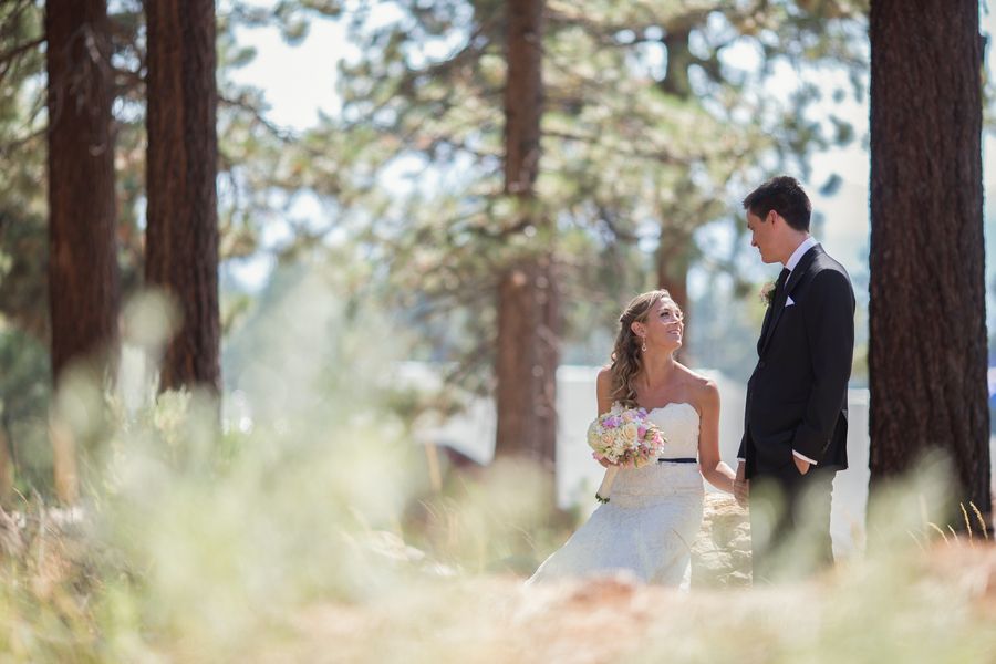 The wedding was very much a DIY event. Loni and her friends made most of the decorations including the cute burlap signs and table runners. They had a super cute candy table full of all their favorite sweets for guests to fill up in their burlap bags to take home as gifts. The cake was absolutely beautiful topped with lovebirds and plated on a big wooden board to match the Tahoe trees.