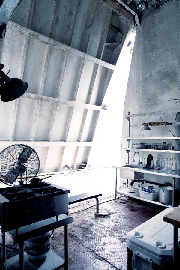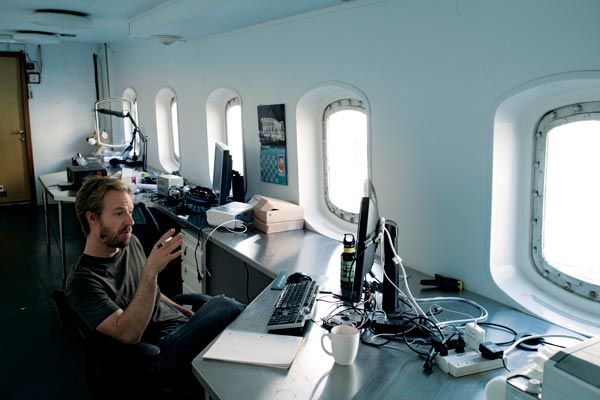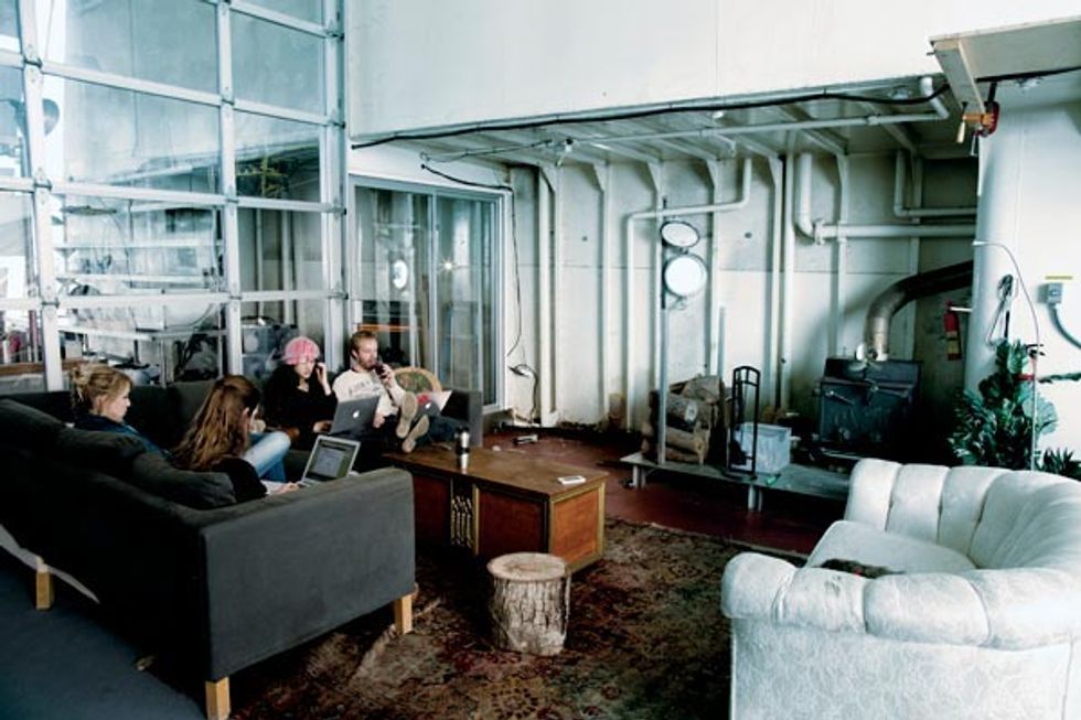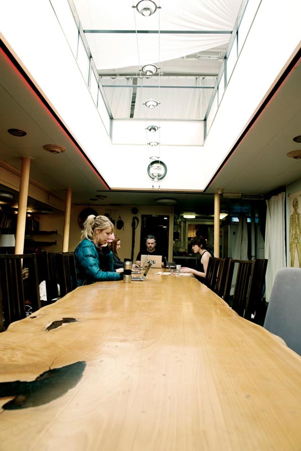 Payment and procedures don't seem to be a high priority for anyone on the Icebreaker. “I've never worked well in a traditional office setting," says Squirrel Sciuridae, who has been operating from the boat for nearly a year. “This space fosters intense creativity while offering a perfect level of distraction—you can't be bothered by the hum of the hydraulics opening the hatch." Levit and Kahle's vision of a community has also been very much fulfilled: When they brokered the deal with Lundberg, they asked that his hot sauce collection and a 30-foot-long cypress communal dining table be left in place. Today the table serves as both a group desk and the site of biweekly dinners for the boat's community. A collection of petite sleeping berths and two showers come in handy when an intense assignment or communiqué with coworkers in Asia requires pulling an all-nighter—a coder wandering around in a bath towel is not an uncommon sight.