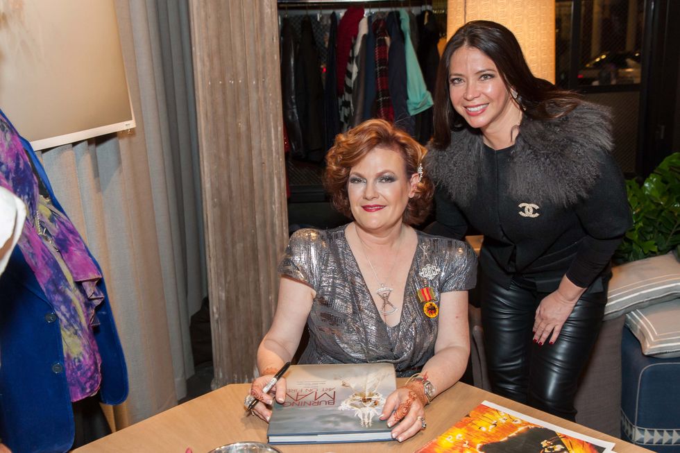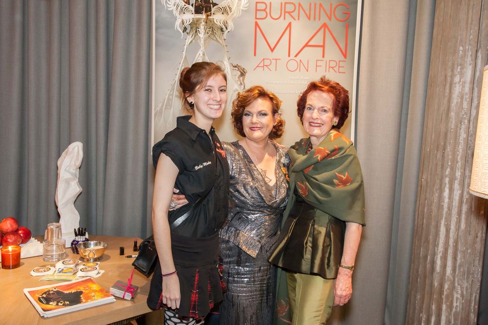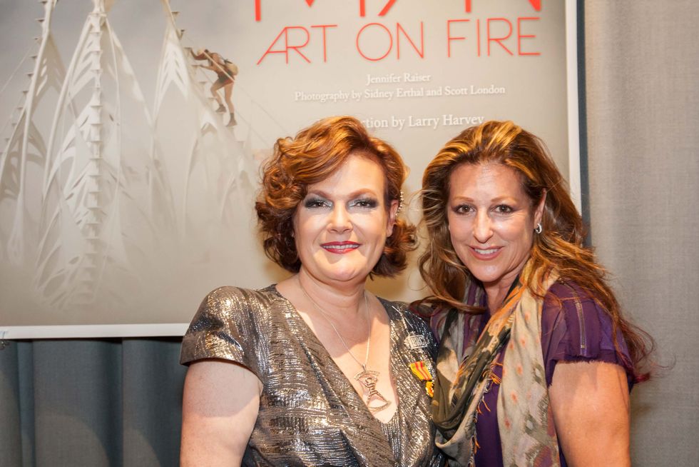 But one glance at her metallic McQueen dress (for she's San Francico's biggest McQueen fan) should set you straight. That seated sultana with copper hair is none other than Jennifer Raiser, signing copies of her new book, Burning Man: Art on Fire, for her adoring well-wishers.
