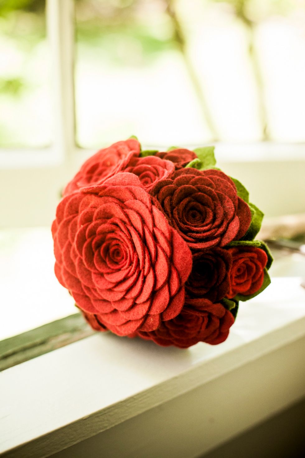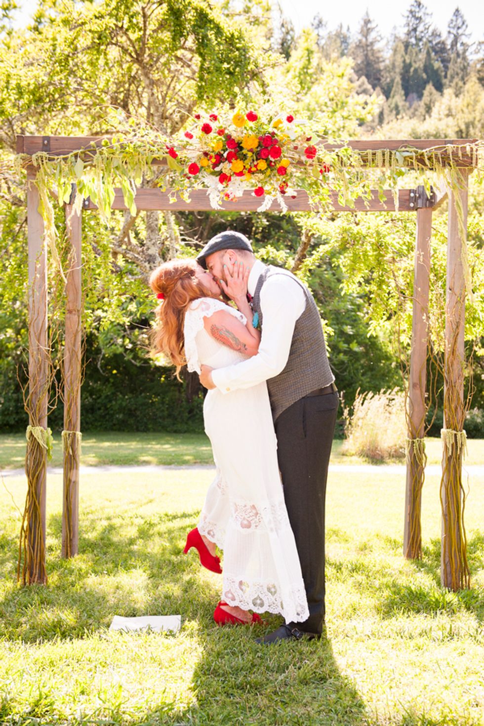 The bride look gorgeous in a long, flowing vintage dress with white lace and embroidery, accented by red Bakelite jewelry and custom-made red suede shoes, as she walked down the aisle accompanied by a single guitarist.