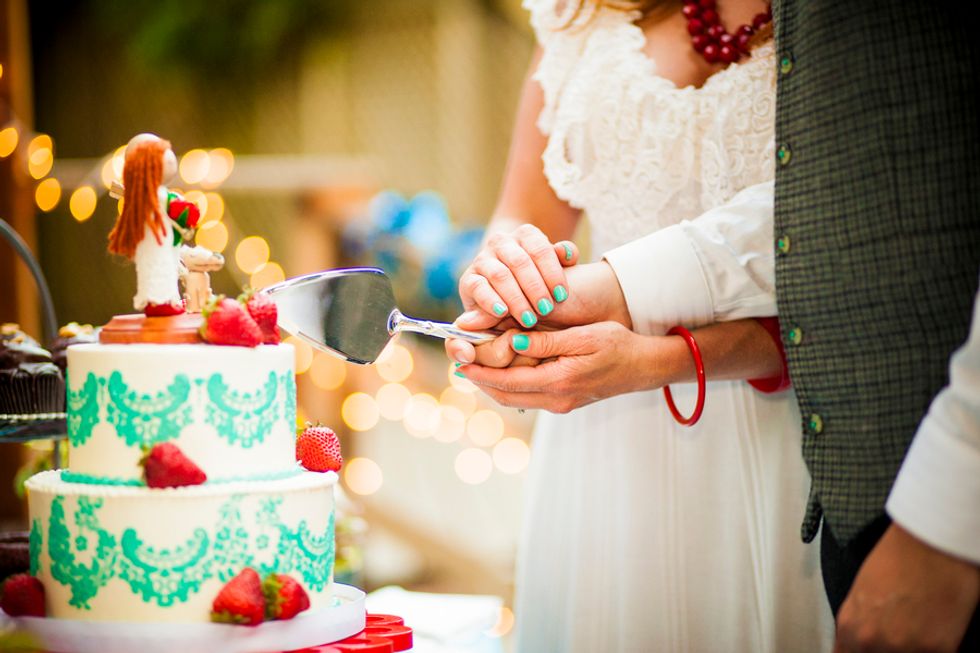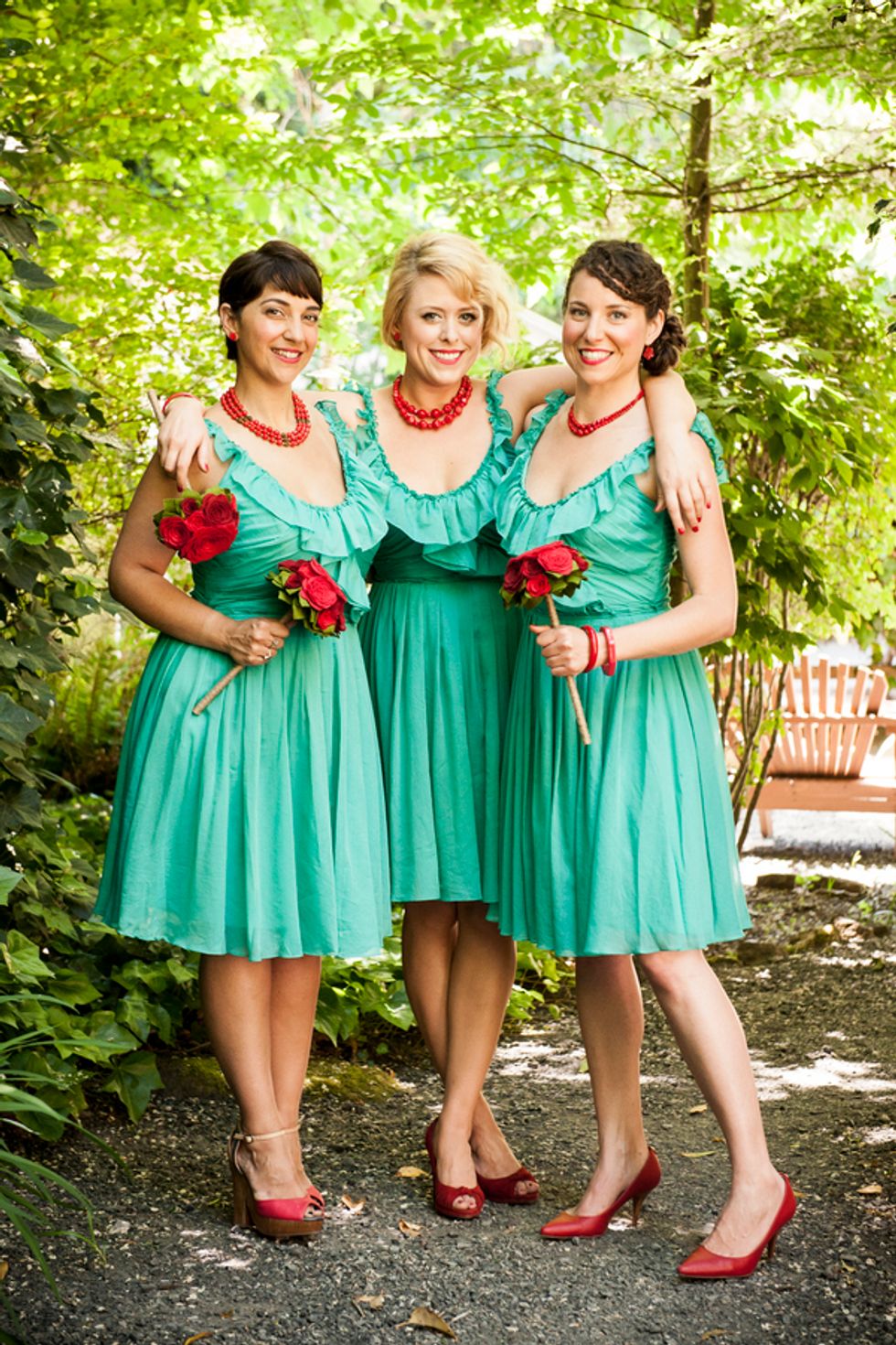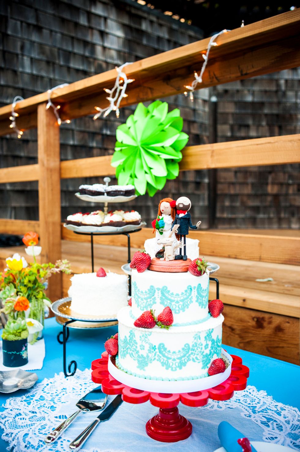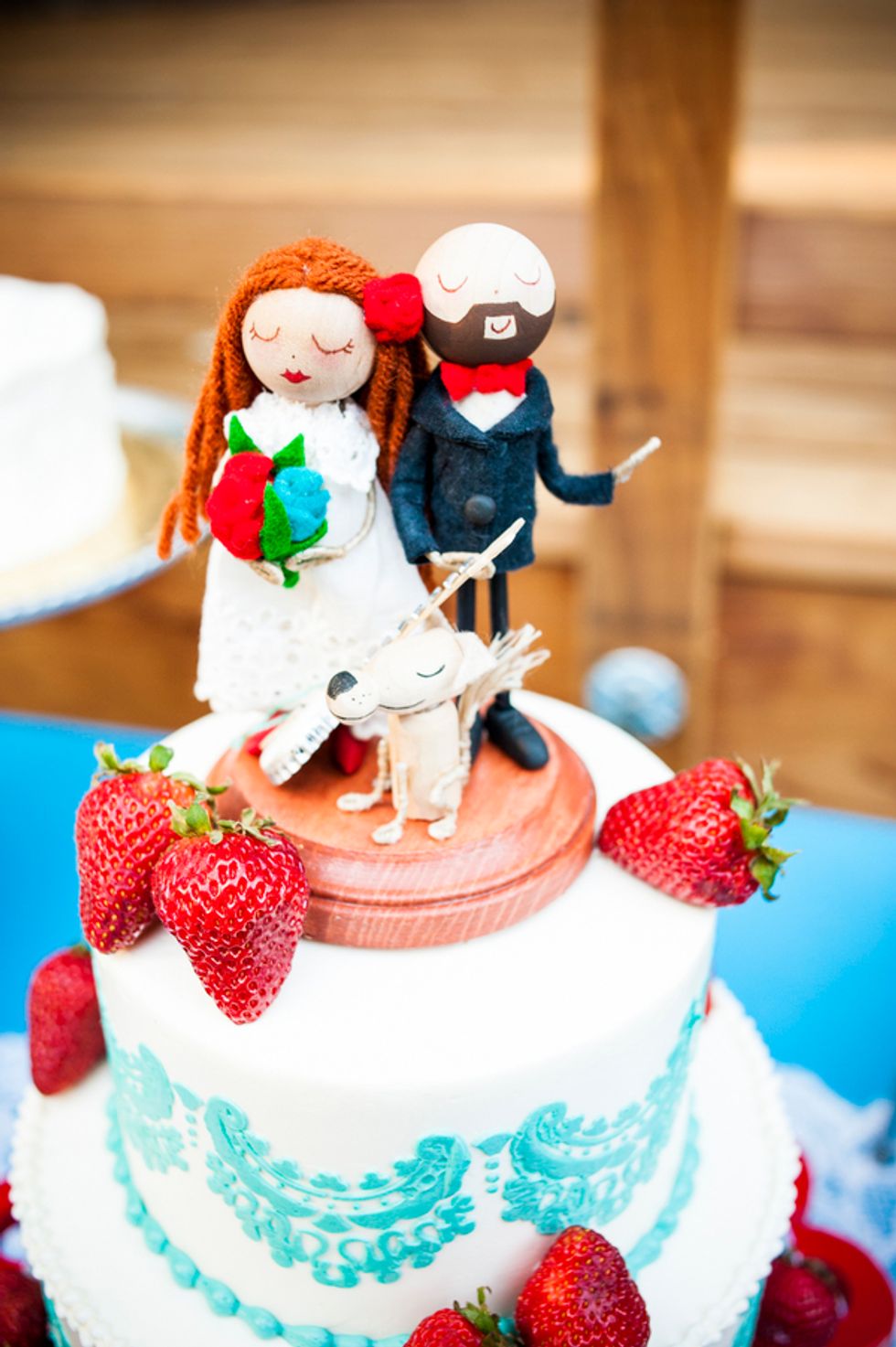 The chosen color theme of turquoise and red played together beautifully in everything from the groomsmen’s suspenders and pocket squares, to the bridesmaids dresses, jewelry and flowers, and even their nails. The bride, a clothing designer by trade, created the table runners, candleholders, place cards, and succulent displays donned in a different prints to match the color scheme. Cory made the cake topper – cute wood and felt figurines in the likeness of the bride and groom, including a tiny banjo played by Cory and a replica of Mr. Peanut their rescue pup and ring bearer. The tiny version of the newlyweds stood atop their three layer turquoise lace and red strawberry cake.