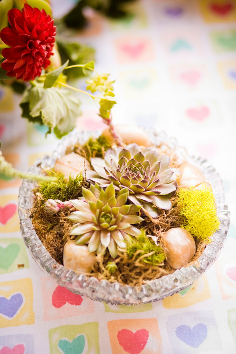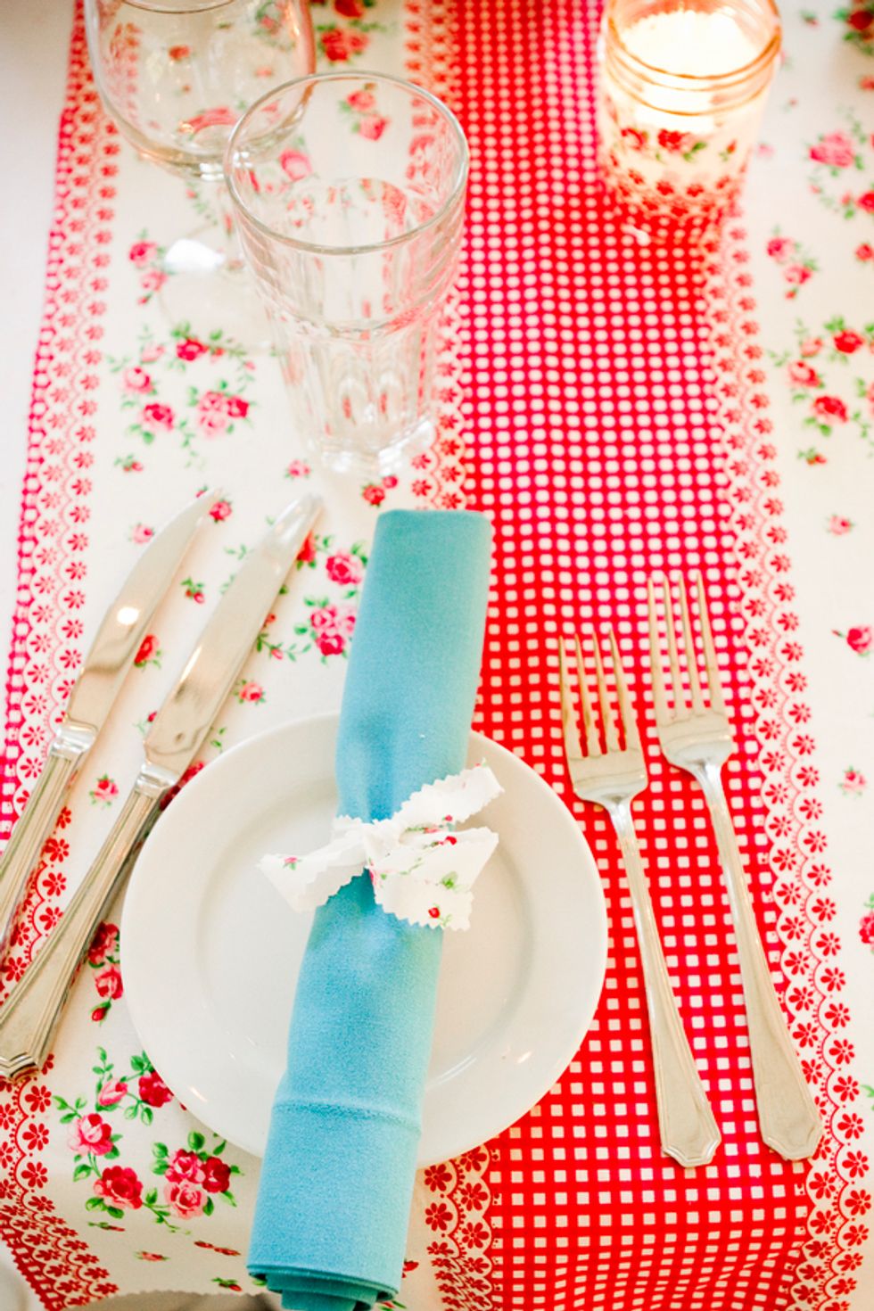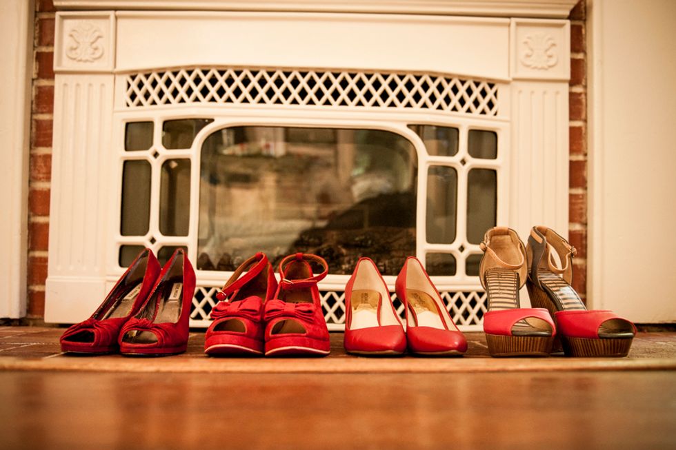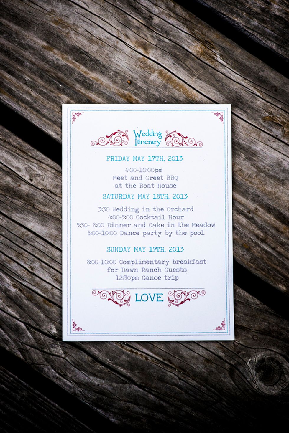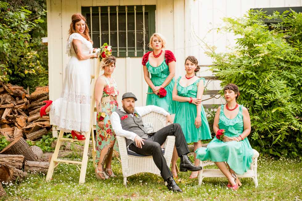 The chosen color theme of turquoise and red played together beautifully in everything from the groomsmen’s suspenders and pocket squares, to the bridesmaids dresses, jewelry and flowers, and even their nails. The bride, a clothing designer by trade, created the table runners, candleholders, place cards, and succulent displays donned in a different prints to match the color scheme. Cory made the cake topper – cute wood and felt figurines in the likeness of the bride and groom, including a tiny banjo played by Cory and a replica of Mr. Peanut their rescue pup and ring bearer. The tiny version of the newlyweds stood atop their three layer turquoise lace and red strawberry cake.