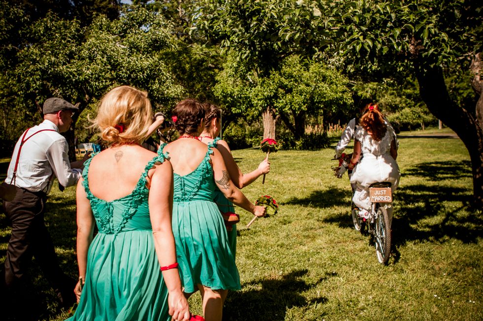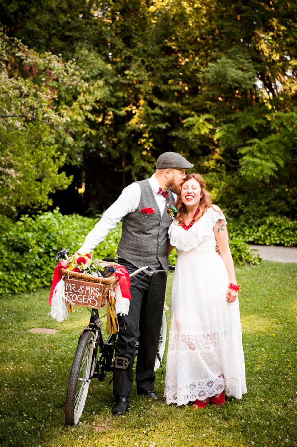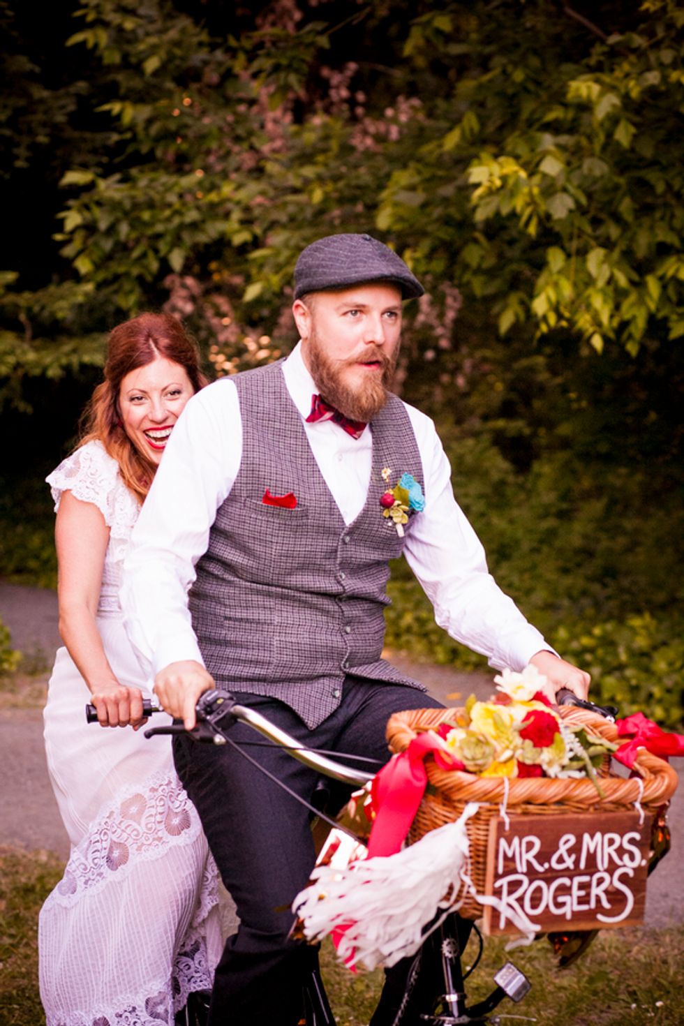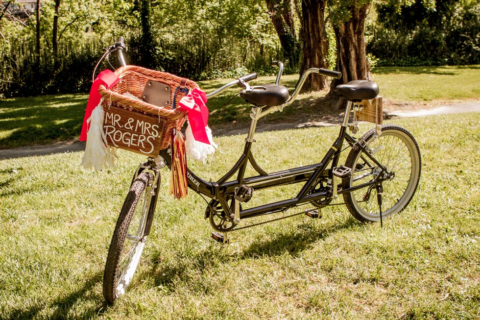 Bikes were also incorporated into their special day, since Cory proposed to Gwen at the finish of an epic ride from San Francisco to LA. After vows were exchanged, they rode off together on a tandem with Mr. Peanut in the front basket.