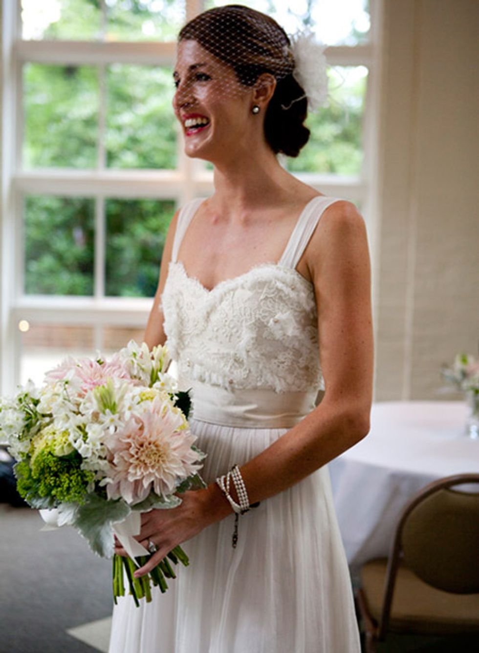 Meanwhile, while reading a DailyCandy item, she discovered her dream dress made by a company called English Department in Portland, Oregon. But looking at the company’s Etsy site, her heart sank when she read it would take twelve weeks to have a dress made. “My mom urged me to try anyway, so I emailed the designer and said I was getting married in four weeks and asked if they had the Oysters and Pearls dress,” Schuyler says. “They had only one, and it was my size. It was perfect.”