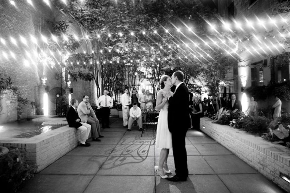 After a ceremony that featured readings from a Pablo Neruda sonnet (her idea) and U2’s “One Love” lyrics (his), everyone headed to a reception at Felicia Suzanne’s, a nearby restaurant. The meal was filled with traditional Southern food with a twist (such as BLT salad with fried green tomatoes). The couple could hear the fantastic band they hired playing in the background as they lingered over the food and savored family toasts that made them laugh and cry. “But we took so long over dinner, the band packed up and left,” says Schuyler. “No one told me, and when I came out to the patio for our first dance, they were nowhere to be found.”
