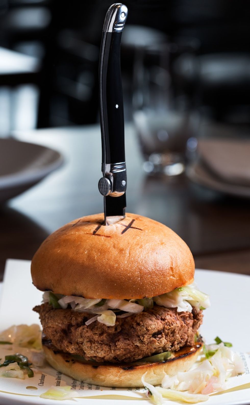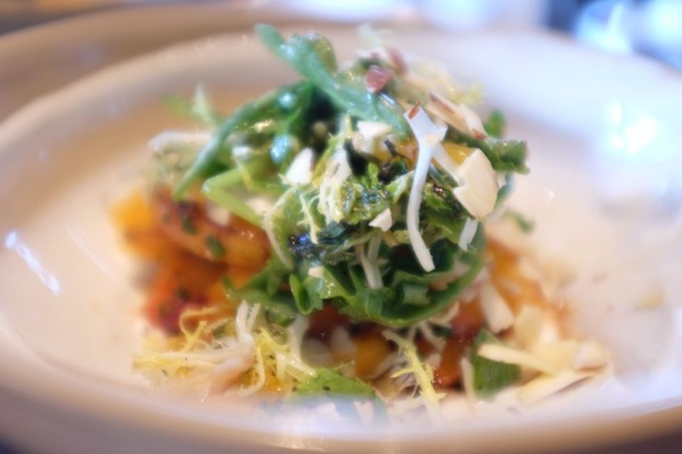 Other must order dishes include the corn ravioli, filled with a creamy potatoes and topped with crisp blue potato chips and chives and the massive fried duck sandwich with house made slaw, pickles and a spicy aioli that arrives speared with a knife. On the lighter side is a dish consisting of sautéed peaches, almonds, honey and refreshing Greek yogurt and mint, served with a fluffy salad of greens.