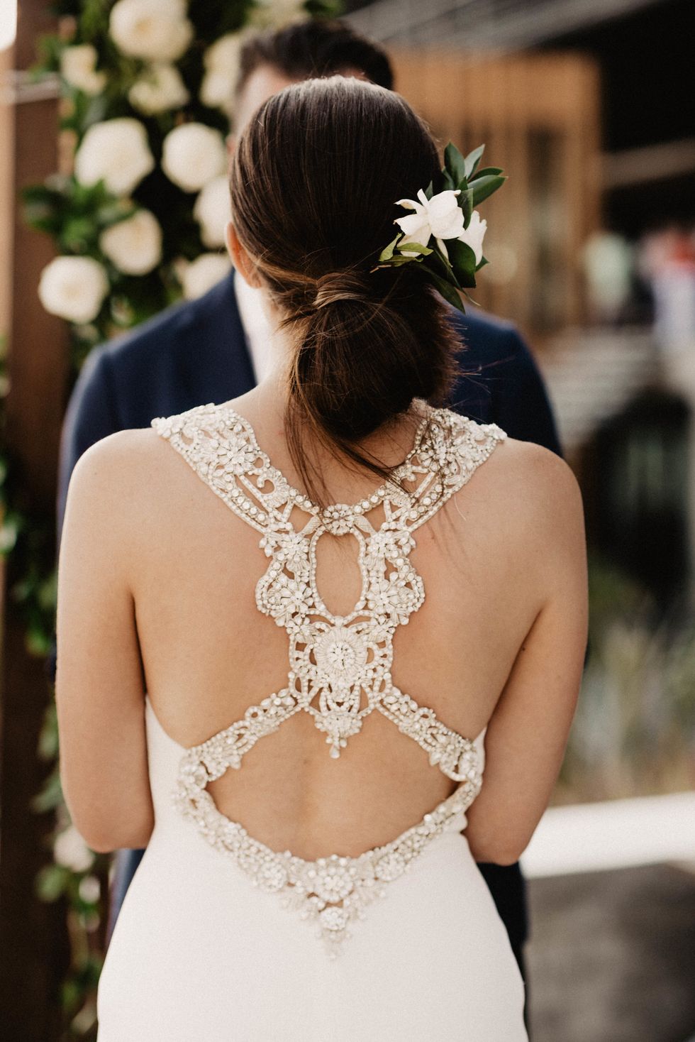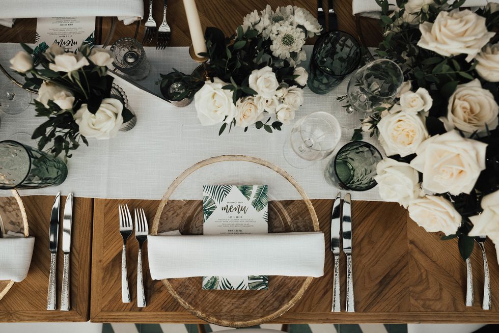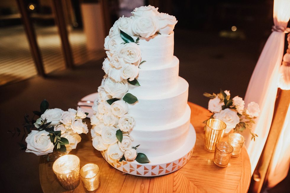 A natural color palette of white and greenery made for striking but classic adornment. Florals consisted of a plethora of white roses, tea roses, lisianthus, peonies, and freesias. The wedding arch offered a unique element with an asymmetric design: a wood frame was draped with fabric on one side and adorned with white roses on the other. Paired with the serene coastal backdrop, their simple theme was chic and timeless.