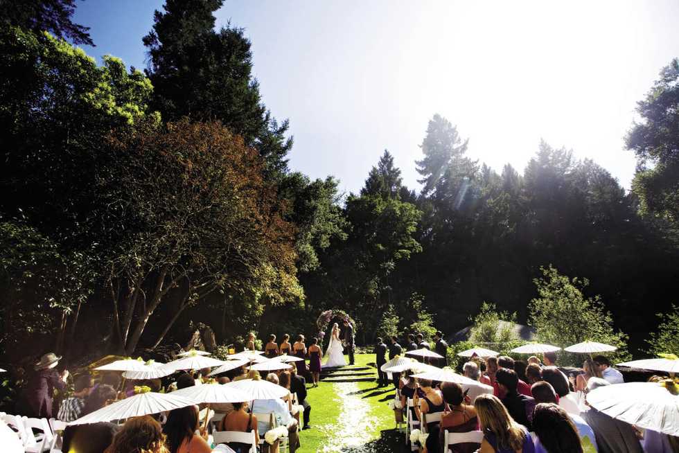The walk down the aisle is the bride's favorite memory. Michael Shapiro, a close friend, sang "I Shall Not Walk Alone" by Ben Harper. "As I walked down the aisle, I heard the words, and I knew in my heart I would no longer be alone," she says. The couple's goal was to let Mother Nature provide most of the decorations for the event. "We wanted everything to be subtle and organic," says Laura. "The place is naturally beautiful, and we didn't want to add a lot of pretense." The parasols, provided by Meadowood, were a lifesaver for friends and family in the heat of the Napa Valley summer.