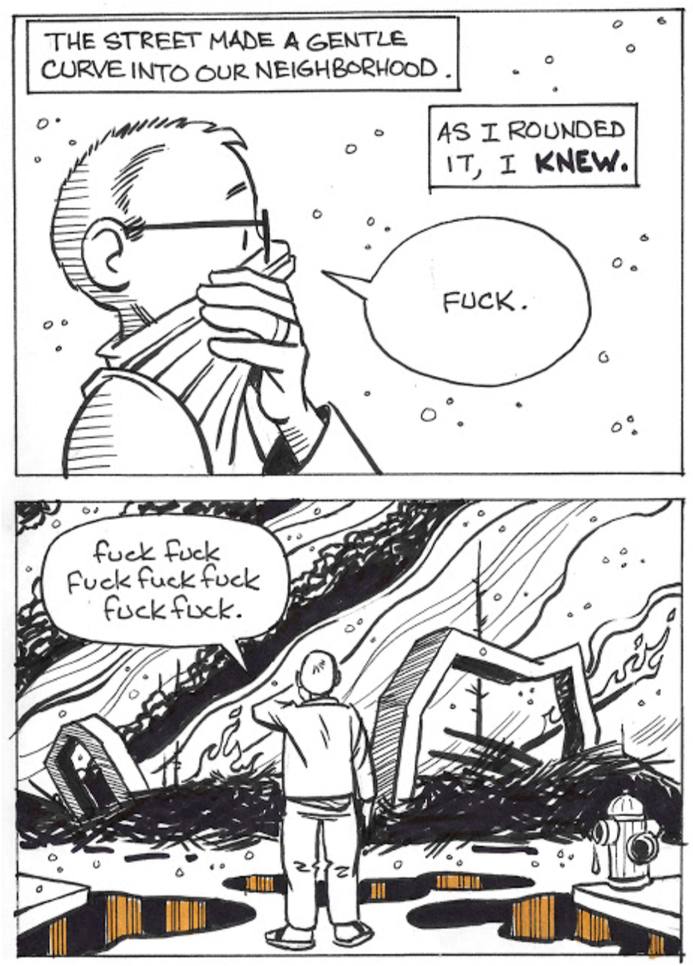 Perhaps most poignantly, Fies ends his panels with the reminder: "Thousands of homes have been destroyed. Ours was one." He challenges his audience to remember that, in the midst of large scale destruction, individuals still exist. He brings emotion and intimacy to statistics. The ink on the page carries even more weight when you consider that all of his art supplies were lost.