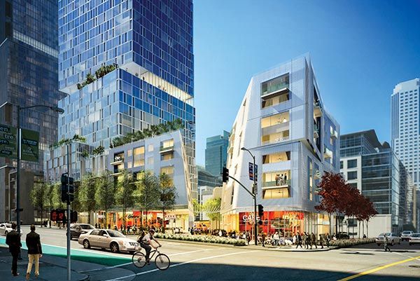 What’s to Love: According to project developer Bill Witte, chairman and CEO of Related California, “Transbay 8 begins and ends with an urban gesture to the neighborhood and a desire to open the site to the public.” He’s referring to the midblock passage—a paseo—that links Folsom and Clementina. According to Witte, this will lend a sense of discovery and community to the project, which includes a tower and townhouses. The sloping sides of the tower let light flood the space. The townhomes, based on older SF homes but with a modern aesthetic, include that great architectural element that encourages gathering: stoops.