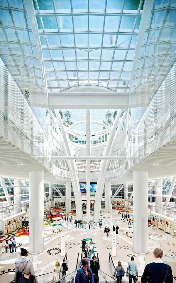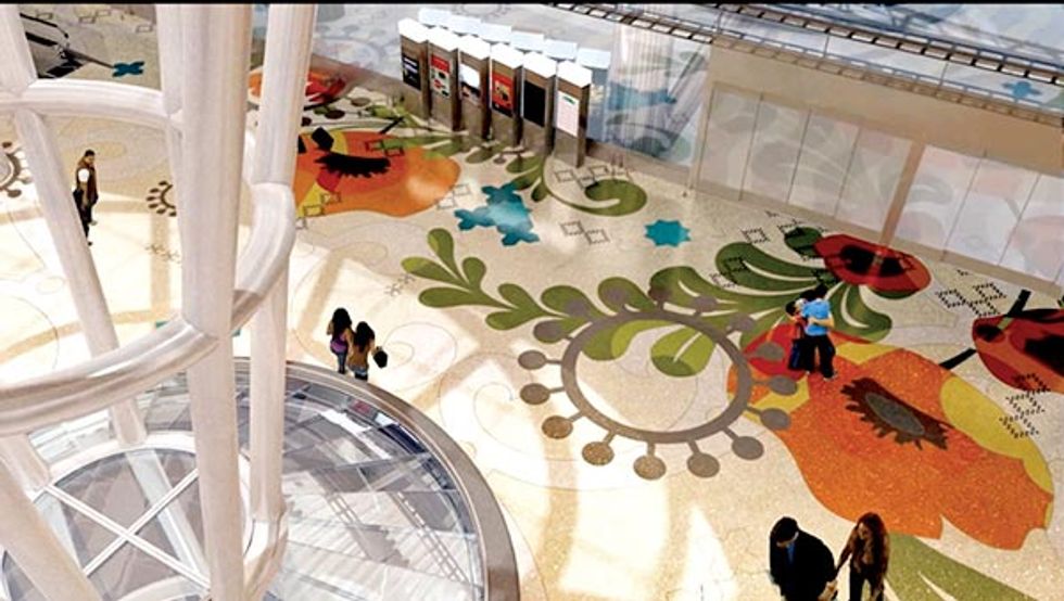 Design Highlights: The TJPA will spend $4.75 million on public art, defining its look and feel. A work by James Carpenter has glowing panels in the ceiling and on the floor. Local artist Julie Chang, who lives a few blocks away from the terminal, designed the terrazzo floor in the Grand Hall with eye-popping images of bright California poppies amid large geometric patterns. SF-born artist Tim Hawkinson has created the rugged abstract image of a 41-foot-tall man, which is being crafted with construction debris from the old terminal.