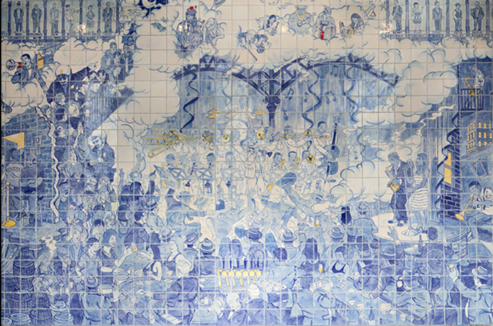 Three murals, hand painted on ceramic tiles by artists Sandow Birk and Elyse Pignolet, in the upstairs lobby and green room will visually help tell the story of jazz.