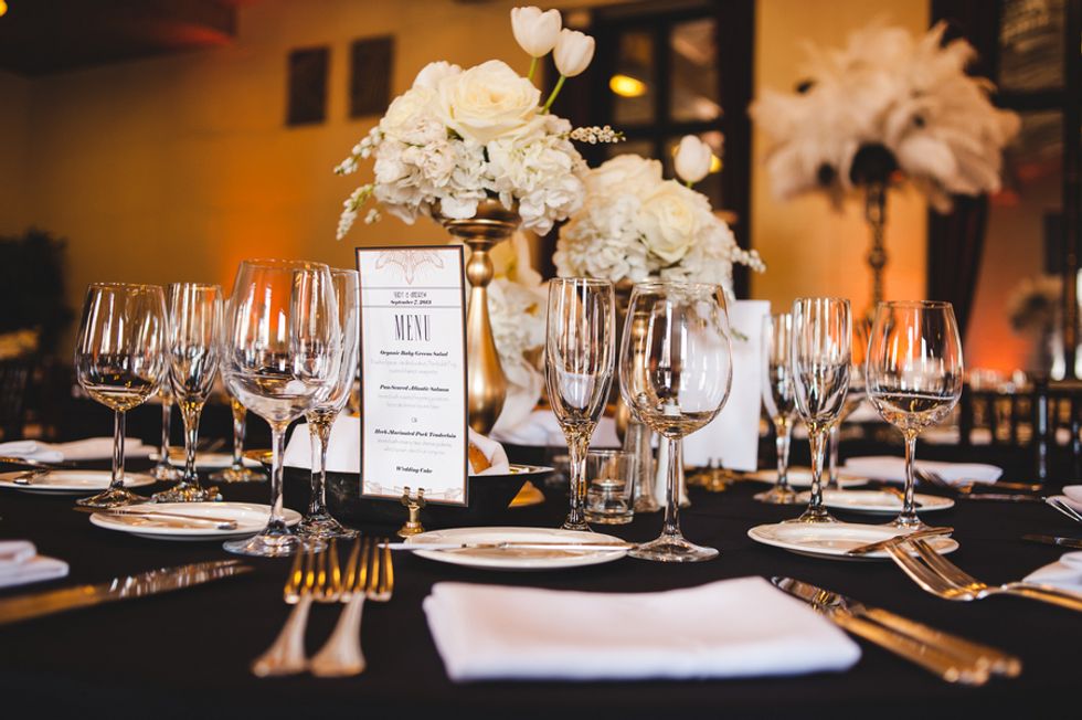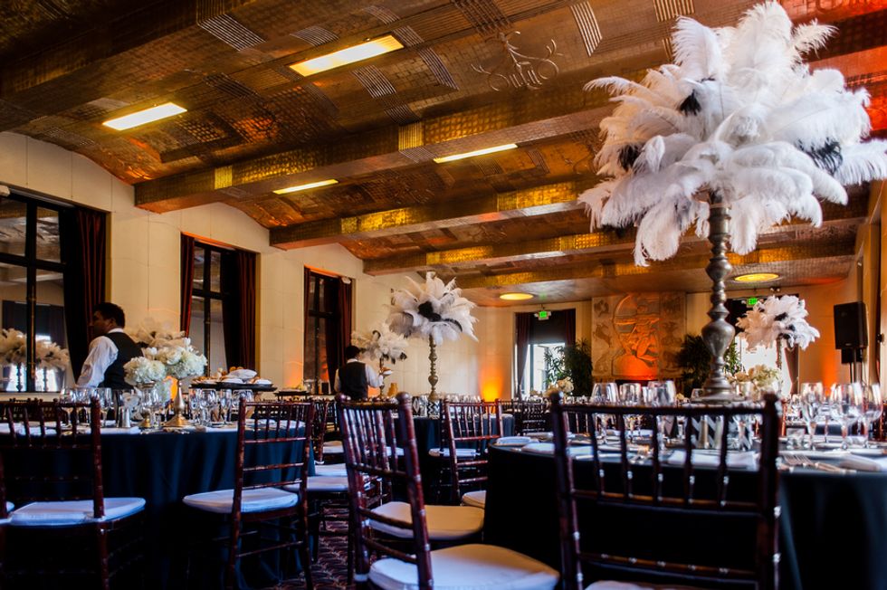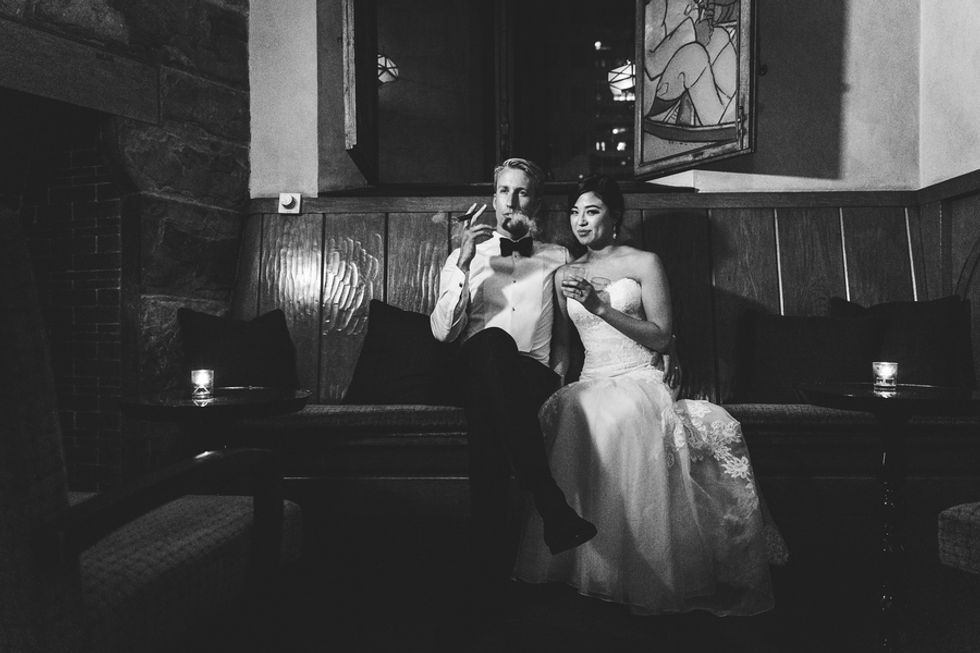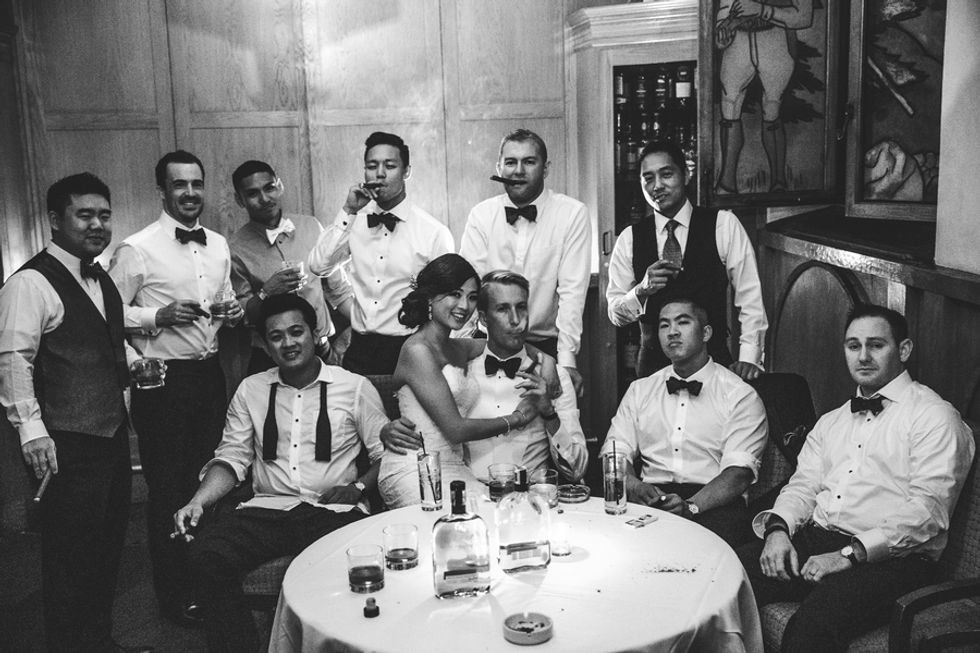 The party that followed featured beautiful feathered centerpieces and a rich golden cake. As the evening capped off, a few of the groomsmen and the bride took advantage of the Cigar Room, for a perfect, Rat Pack inspired group shot.