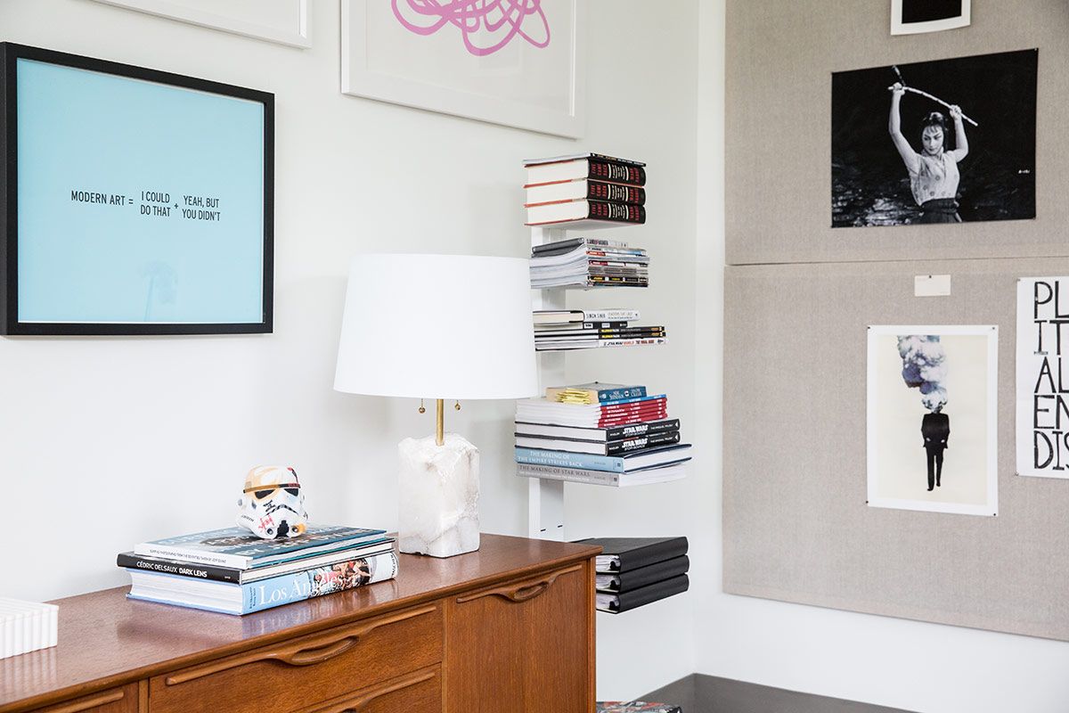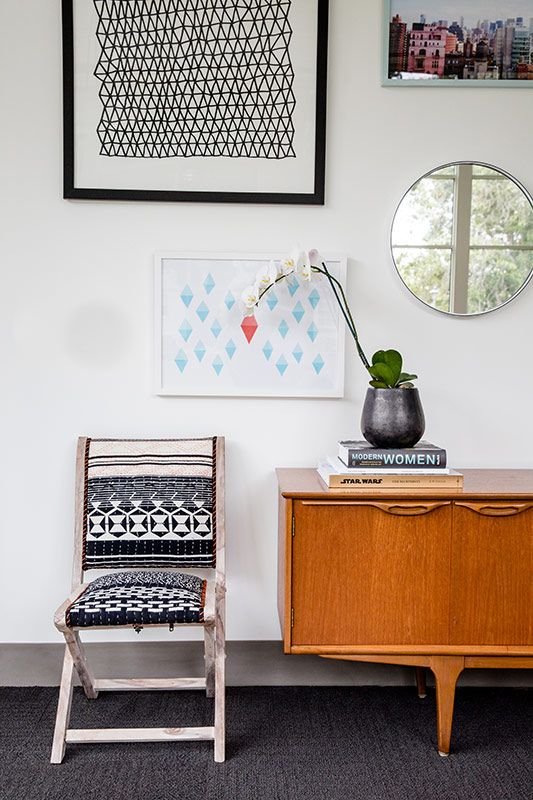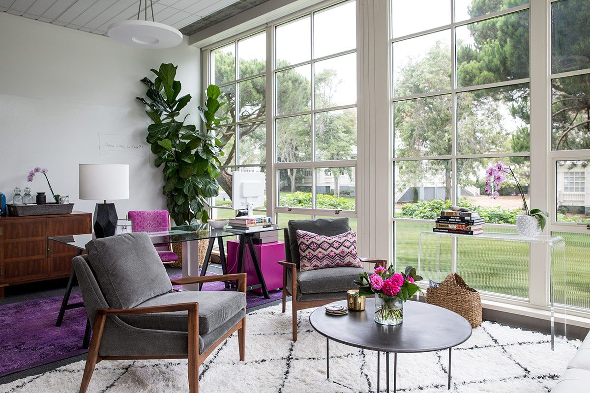 Sometimes you just need to start over. Pre-makeover, this office was all sage green and burgundy with chunky Craftsman furniture. The client, an executive at a creative studio in the Presidio, wanted a mix of ethnic glam, midcentury accents, and bright color, in a fun but professional space that she would be excited to return to every morning. Homepolish designer Heidi Caillier used neutral notes to keep pops of fuchsia from being overbearing, and she got the lighting just right with new ceiling fixtures and a sprinkling of lamps. An inviting seating area, linen pinboard for inspiration images, and Ideapaint on one wall make the space just as functional as it is beautiful.