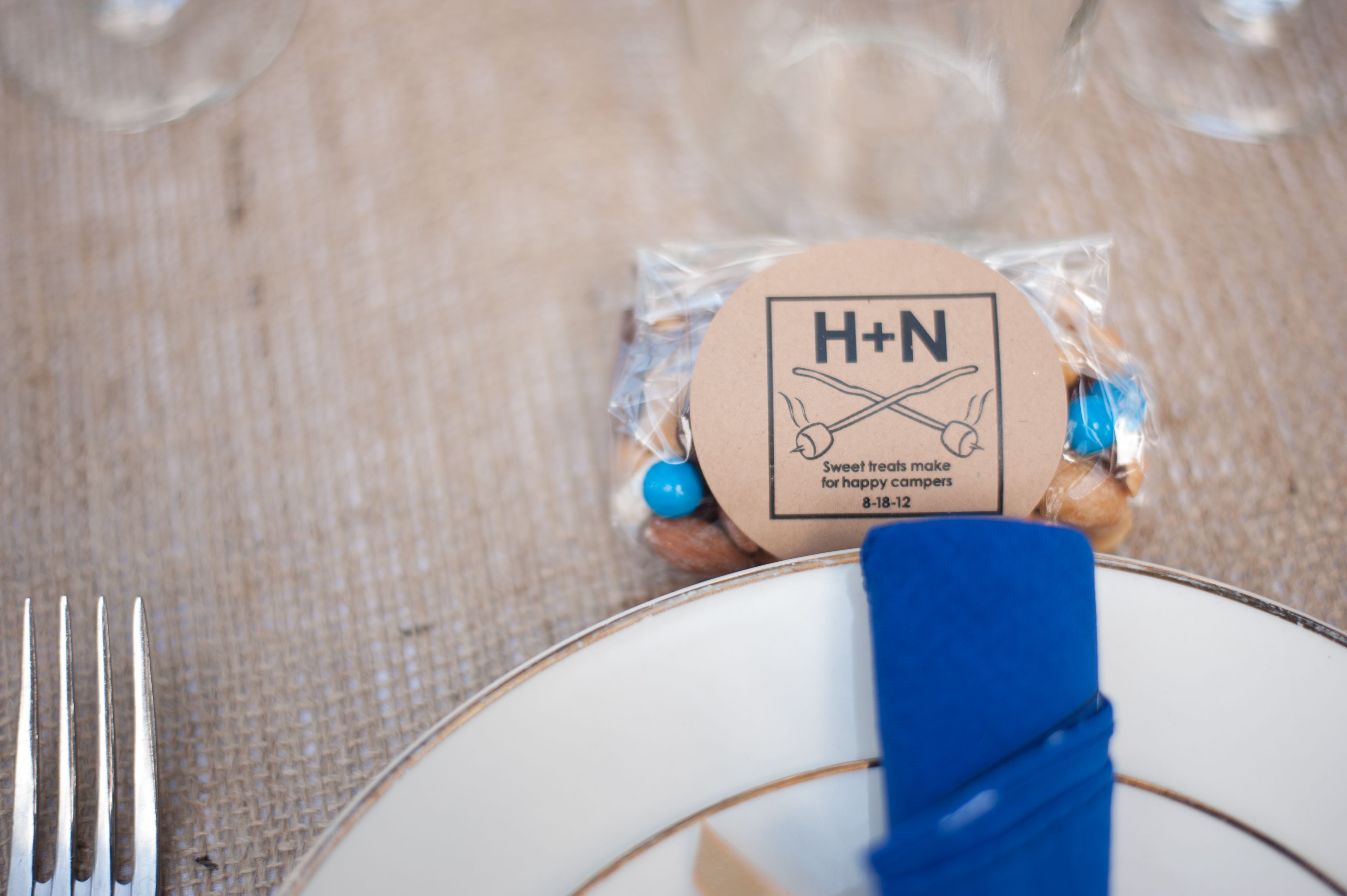 Because Nick and Hannah both love backpacking, and Hannah loves glitter and sparkle, this couple decided that "glamping" would set the tone of their August wedding. From the miniature tent that topped the cake to the gold glitter washi tape that secured the trail mix, they tried to implement equal parts glamour and camping into the theme.