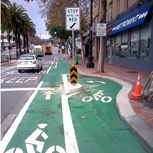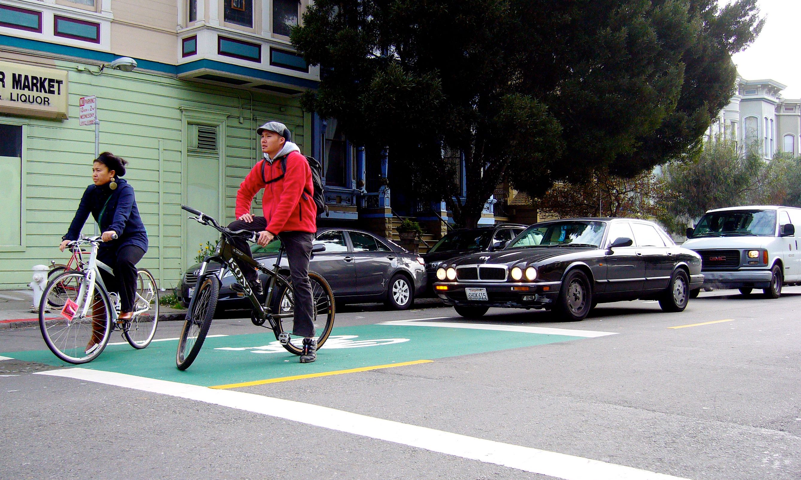 Bike Box: Bike boxes are becoming more prevalent in San Francisco, though you’ll see more of them in Portland. These green boxes are painted at intersections, just behind the crosswalk. They’re designed to give bike riders a safe spot to stop, keeping them out of the danger of any right-turning cars, and make it so you don’t have to breath car exhaust while waiting at a light. If you’re driving, please stay out of the bike box, even though your car probably fits right inside it.