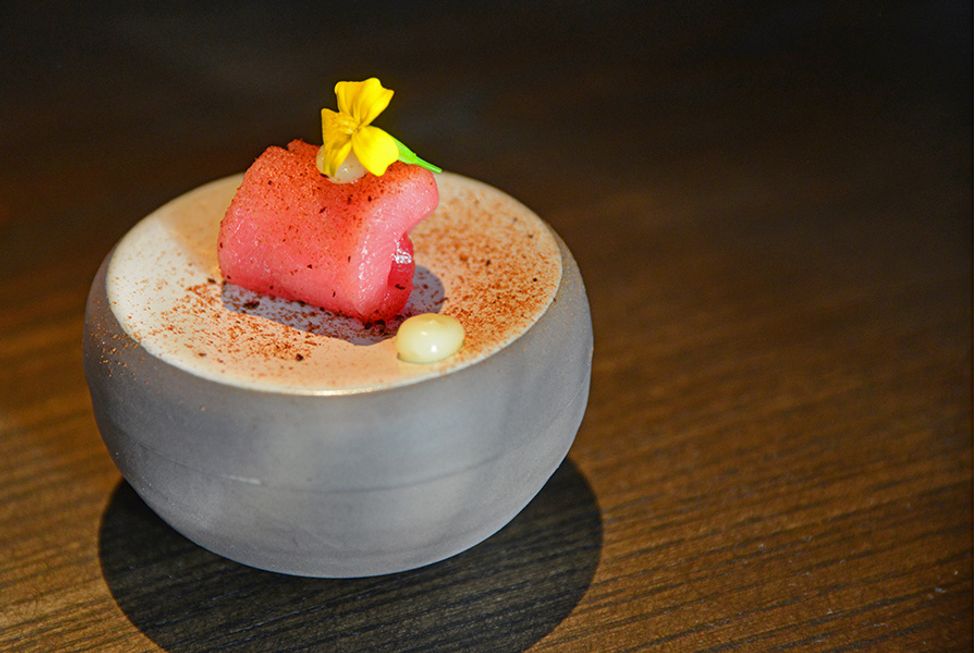 On a recent evening, when my dining companion and I opted for the startlingly economical $80 chef's tasting menu at Madcap, the Japanese influence was on full display from the opening salvo: an exquisitely fresh and almost bubblegum-pink morsel of Bigeye tuna, adorned with a tiny yellow marigold and garnished with soy salt and a little button of jellied yuzu, a sharply acidic citrus fruit native to East Asia that is frequently used in Japanese cuisine. Next up, the aforementioned scoobie, served as an accompaniment to an intensely enjoyable soup made from burstingly ripe and deliciously sweet heirloom tomatoes pureed to a silken creaminess and decorated with dashes of extra virgin grapeseed oil, which, looked at in a certain way, called to mind a somewhat canine smiley face.