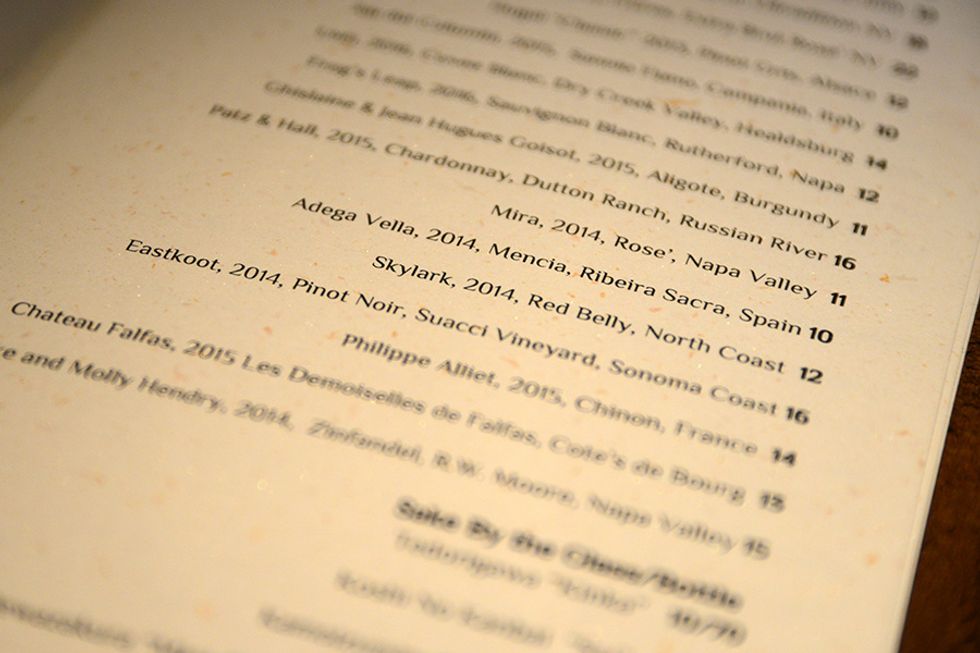 We were, by this point, three glasses into a wine pairing, drawn from a wine list curated by the chef's wife, Kim Siegel. The Siegels first met at The French Laundry and have worked together intermittently ever since. While Siegel never trained formally as a sommelier, she said, "being around food and at great restaurants, you learn about wine as you go along. And being a person who drinks wine, and going out to eat a lot, you're always your keeping eyes open, and constantly asking questions." Her own modesty aside, Siegel's taste in wine is as sure as it is astute: from the florally Alpine essence of a pinot gris from the Alsatian winery Famille Hugel, to a brightly aromatic pinot noir from Mira in the Napa Valley, to the current pour, a brisk, shimmery-gold and terrifically grapey Fiano from the Campanian producer Aia dei Colombi.