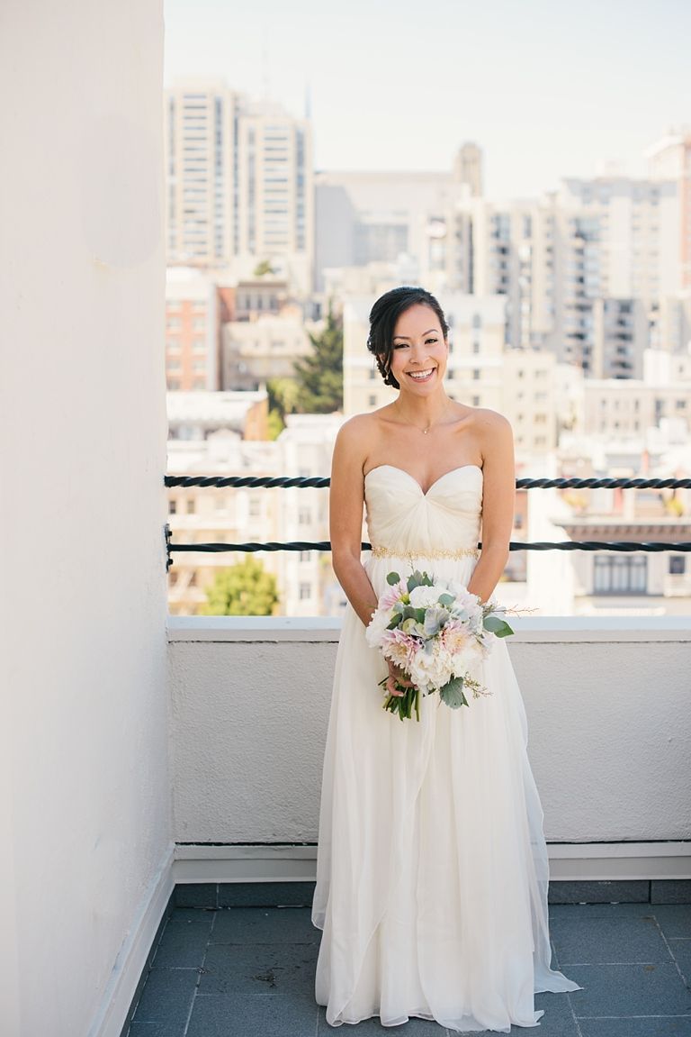 "We wanted to have an intimate wedding that was indicative of what SF meant to us – historical architecture and tradition with amazing views of a thriving urban downtown skyline. We were so happy with our venue choices as that was the hardest part for us! Having our ceremony at the Old Mission Dolores, the oldest building in San Francisco followed by our reception at Adagio with its amazing city windows and access to a balcony right off the dinner area was perfect.