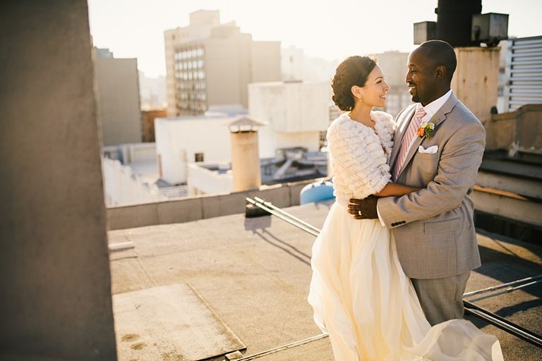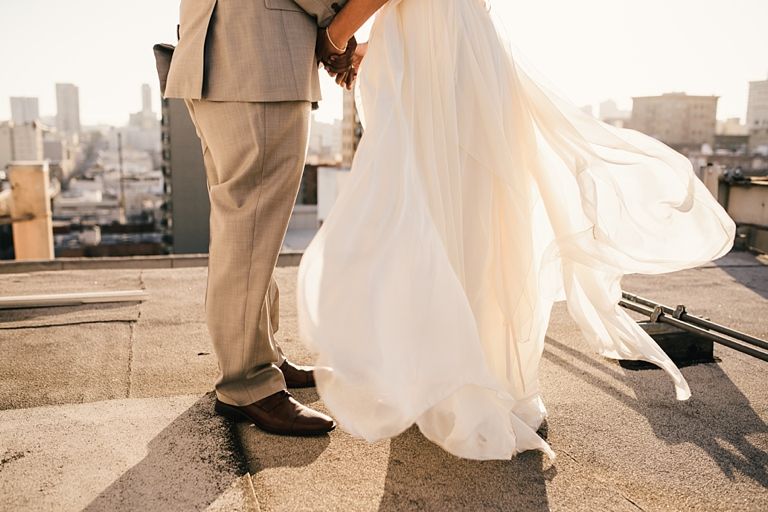 The couple's traditional Catholic ceremony took place at the iconic Mission Dolores where both Laura's mother and father walked her down the aisle. The bride looked gorgeous in a flowy gown with a delicate gold belt. An intimate reception at Hotel Adagio followed. The couple snuck onto the roof of the hotel to capture stunning photos in front of the city skyline. Back at the party, the newlyweds cut and served pie for dessert before spending the night dancing with family and friends.