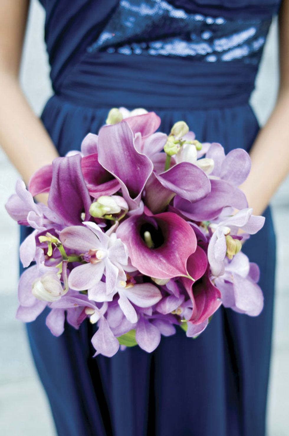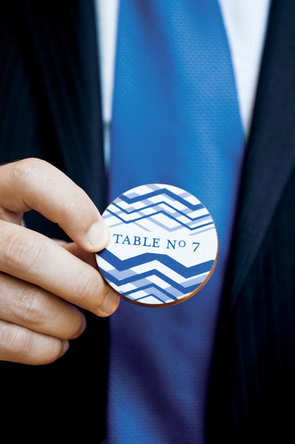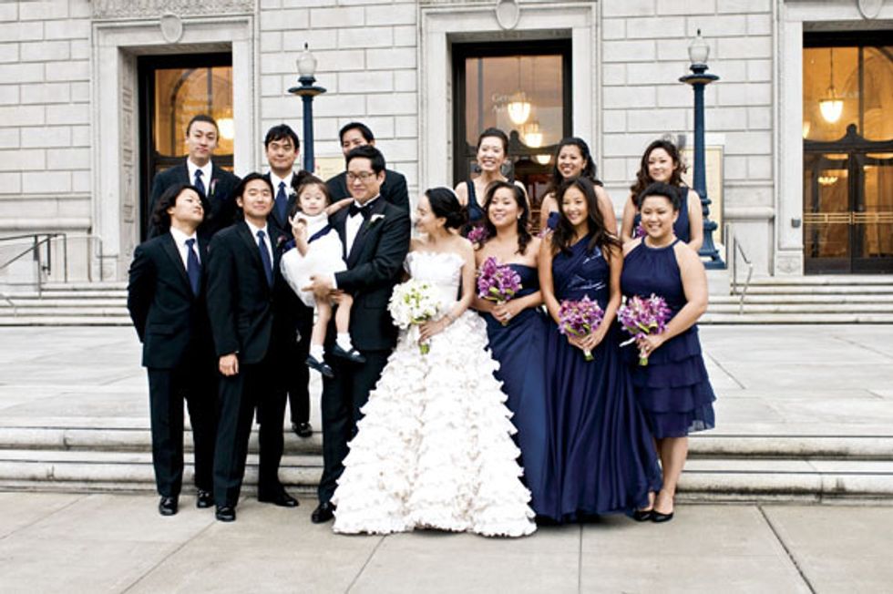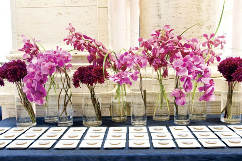 Because Soomin works at an art gallery, the San Francisco Asian Art Museum was a natural choice. The artistic notes included a sculptural white bouquet of orchids, hydrangeas, and calla lilies. The bridesmaids wore deep navy-blue dresses of their choice. "I wanted them to wear the style they liked and that looked best on them," says Soomin. The groomsmen wore matching ties. Magenta flowers, seen here on the escort card table, provided splashes of color throughout the event. Table numbers were printed on circles of chocolate. Soomin loves patterns, so three that work in harmony were selected and printed on fabric, which was used as table runners and wrapped around pillars and vases.