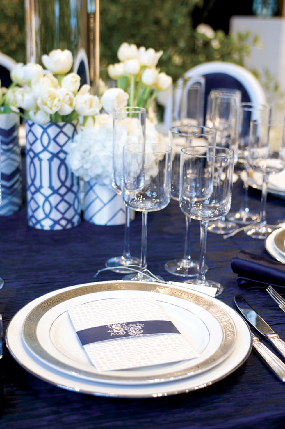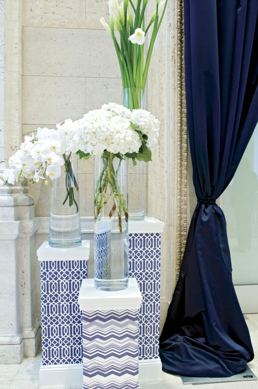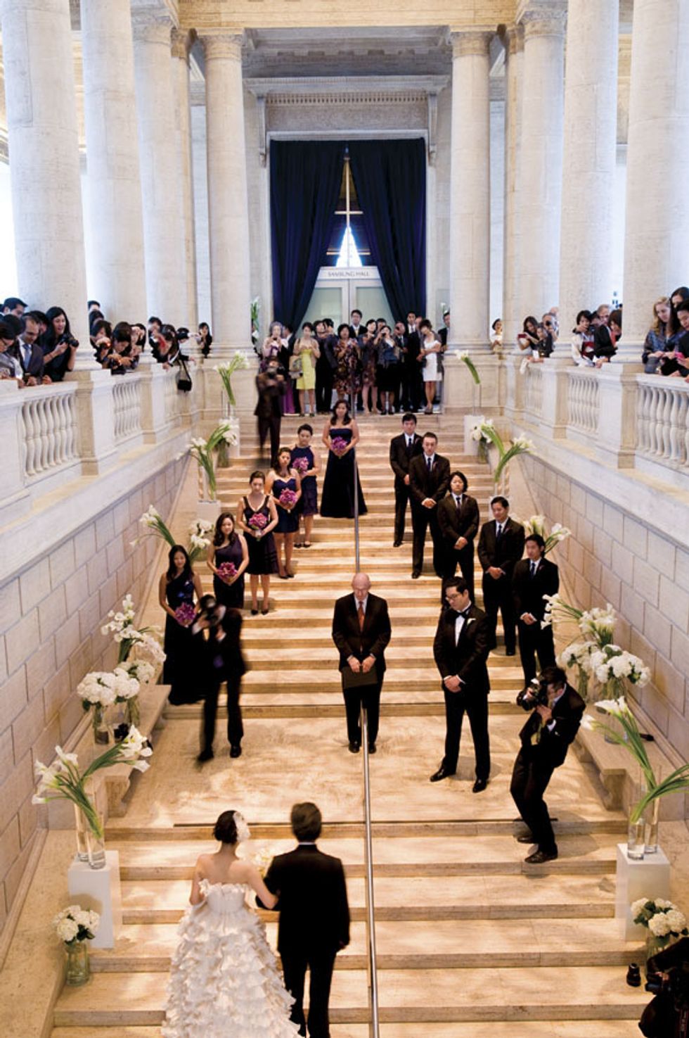 The couple chose to marry on the museum's grand staircase as their guests watched from the balconies. The program was created in a classic blue-and-white style. Soomin wore a ruffled gown by Oscar de la Renta. Bridesmaids carried pink bouquets. "I like how that color looks against the dark blue," says the bride. Deco-style blue-and-white velvet chairs were custom-made by Hartmann Studios for the event.